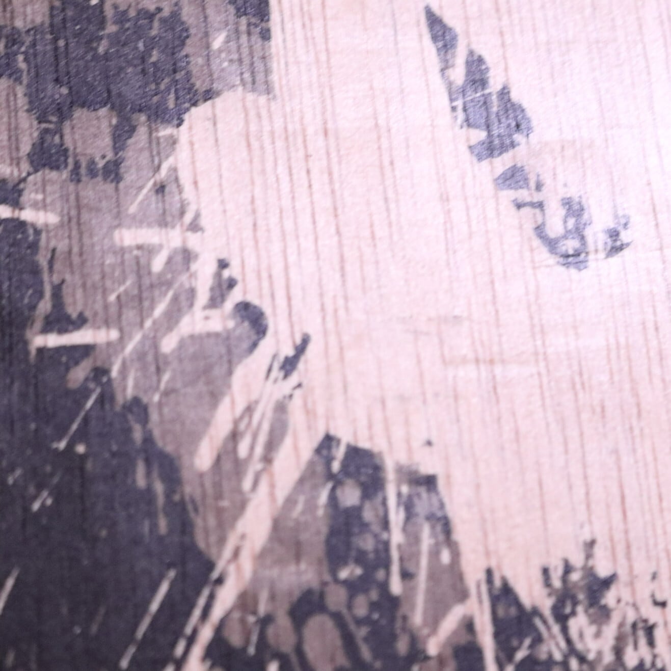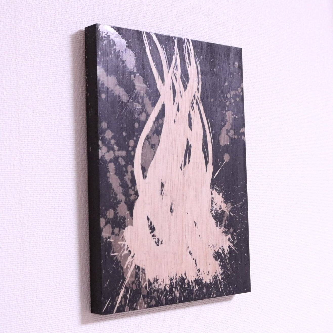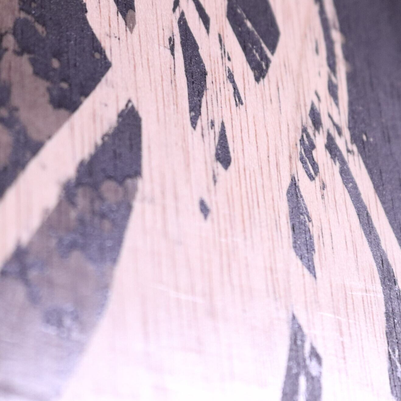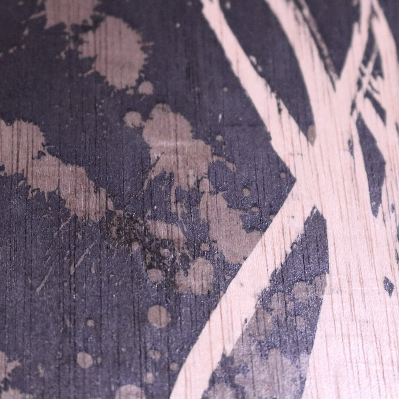 蝋で描き、墨を重ね、削り落とすことで木の色と木目が浮かび上がる独自の技法です。