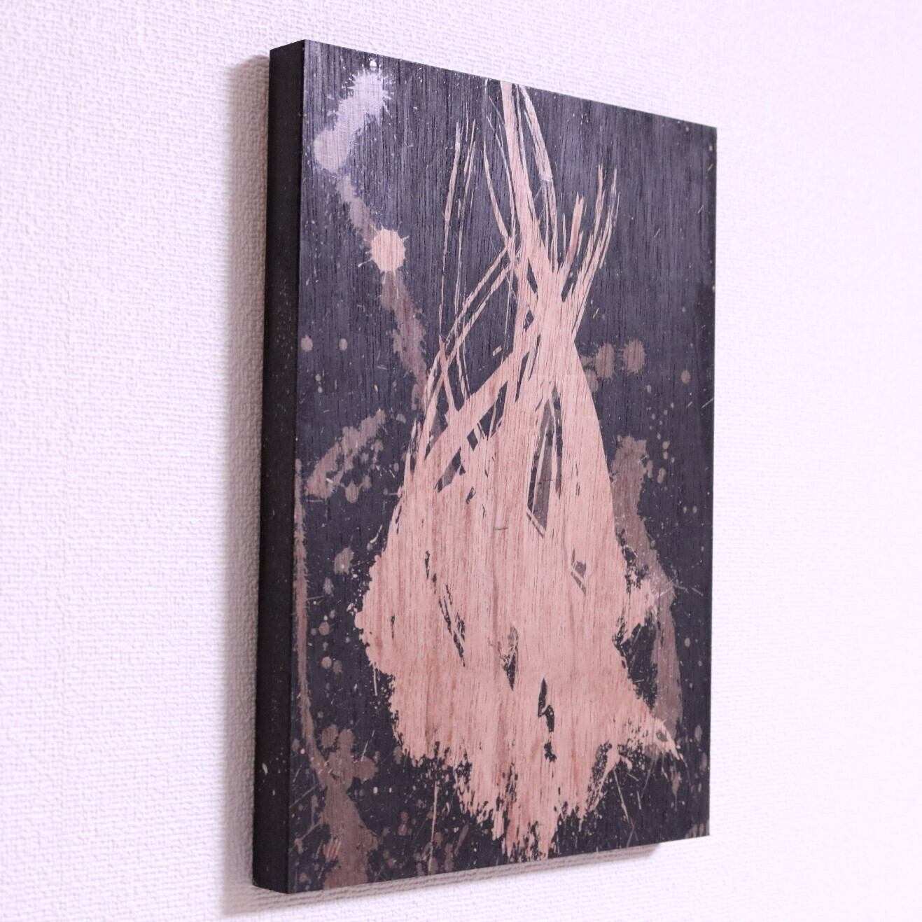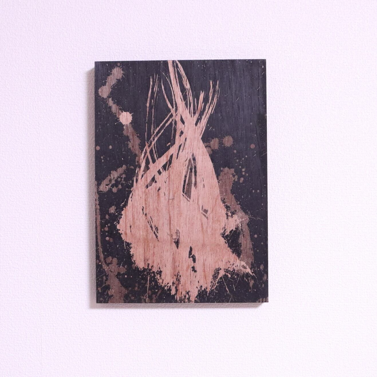 ・技法:蝋削画(蝋・墨・木製パネル)