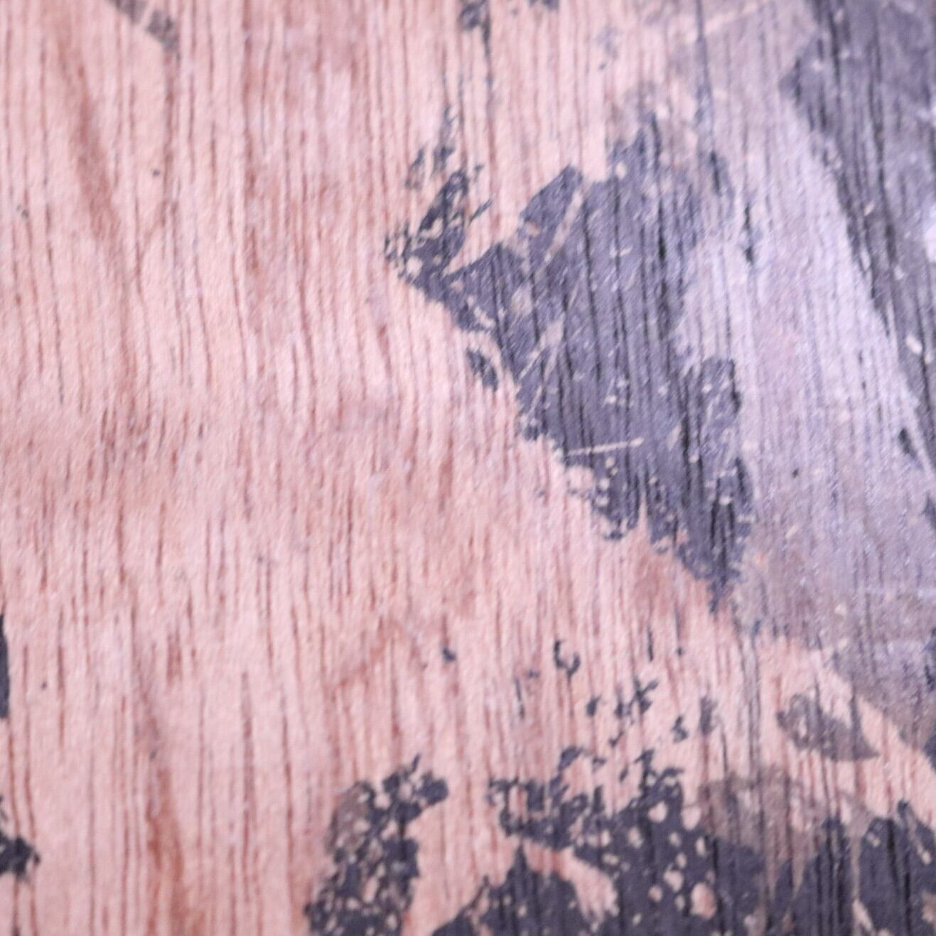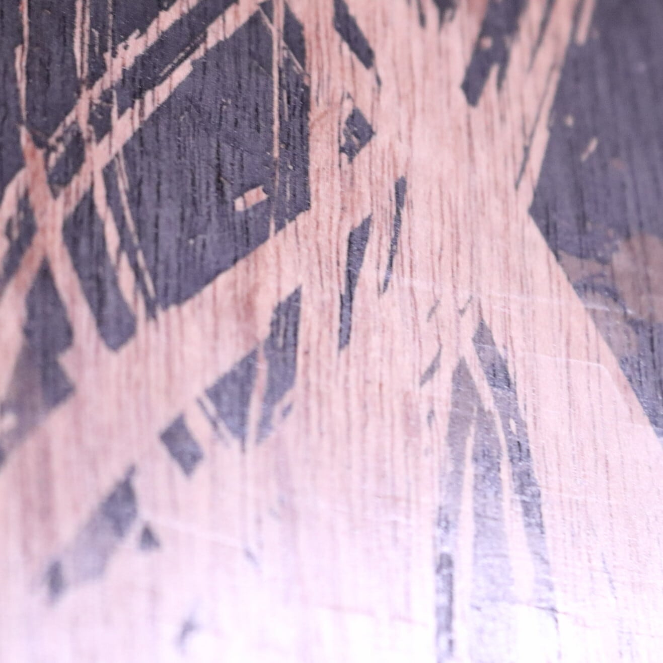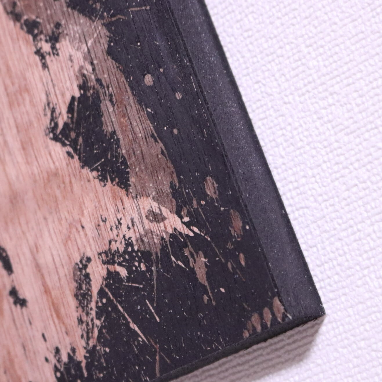 蝋で描き、墨を重ね、削り落とすことで木の色と木目が浮かび上がる独自の技法です。