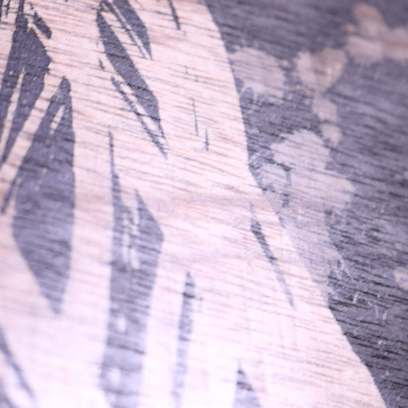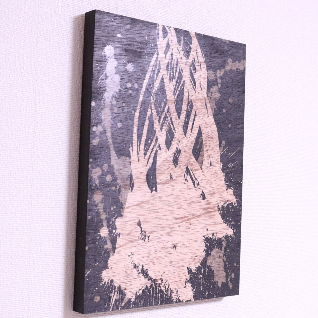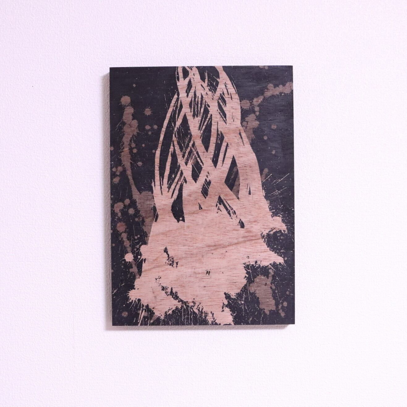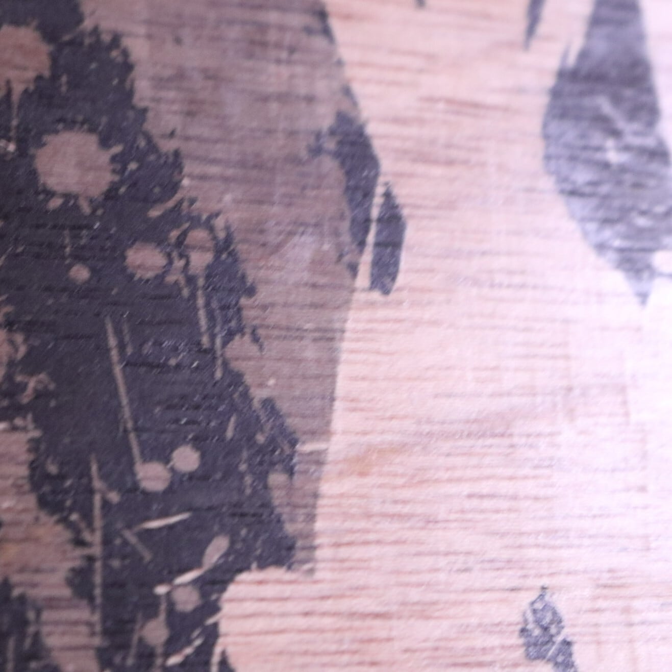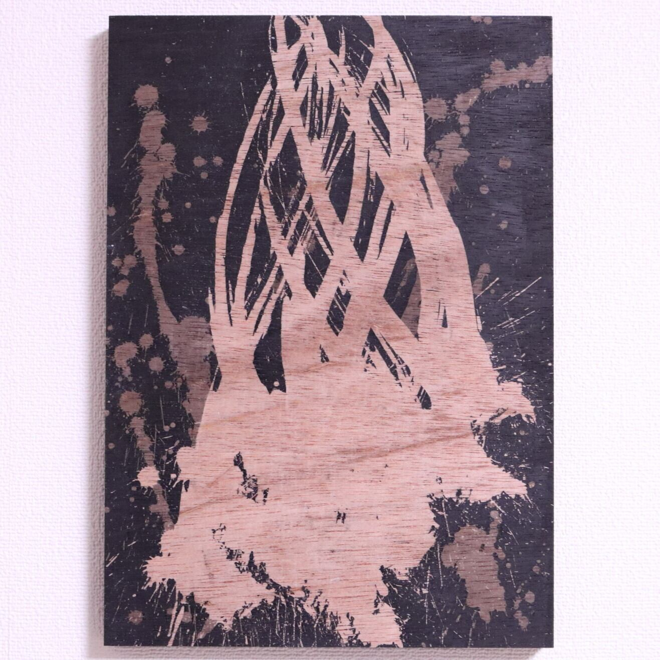 蝋で描き、墨を重ね、削り落とすことで木の色と木目が浮かび上がる独自の技法です。