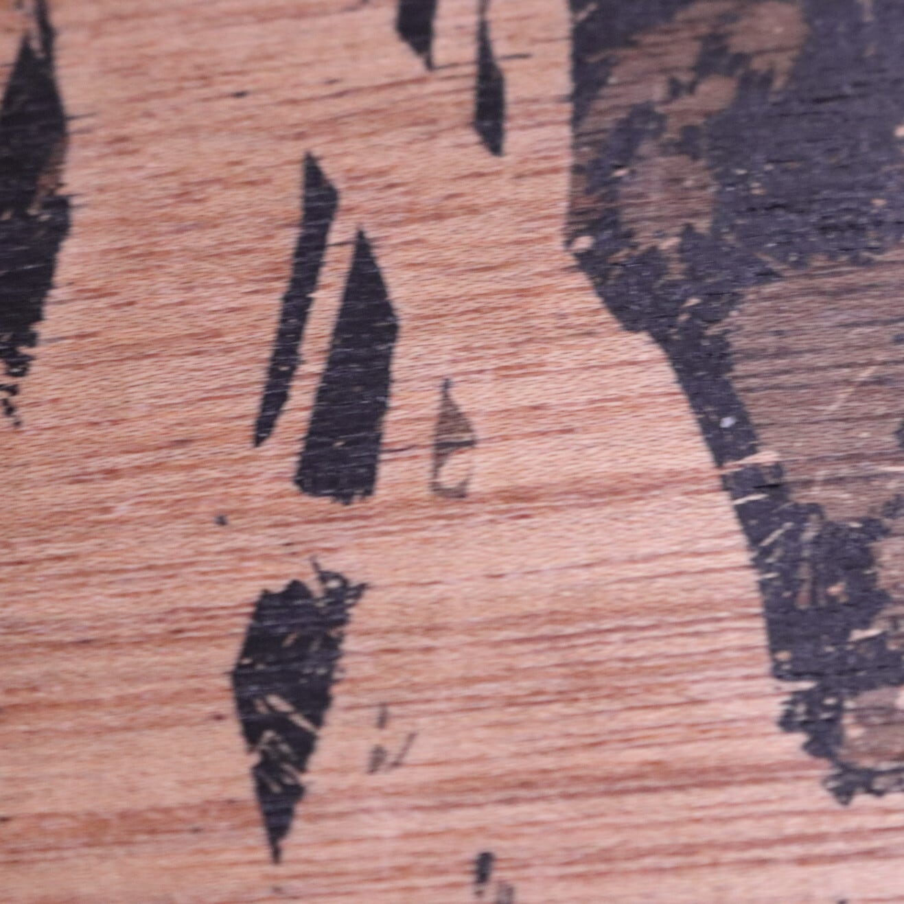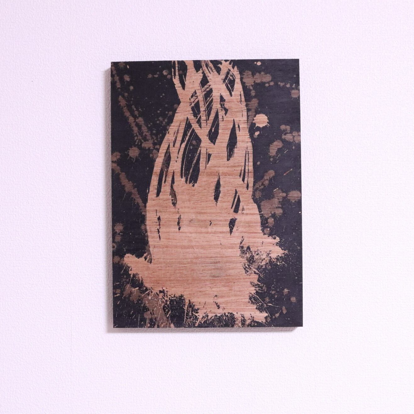 蝋で描き、墨を重ね、削り落とすことで木の色と木目が浮かび上がる独自の技法です。