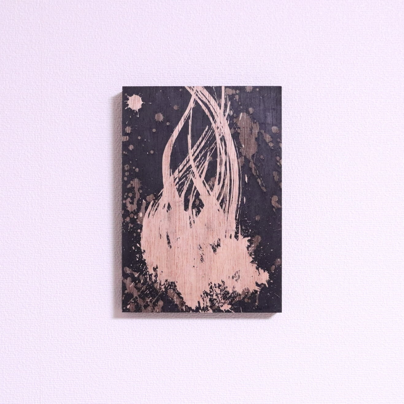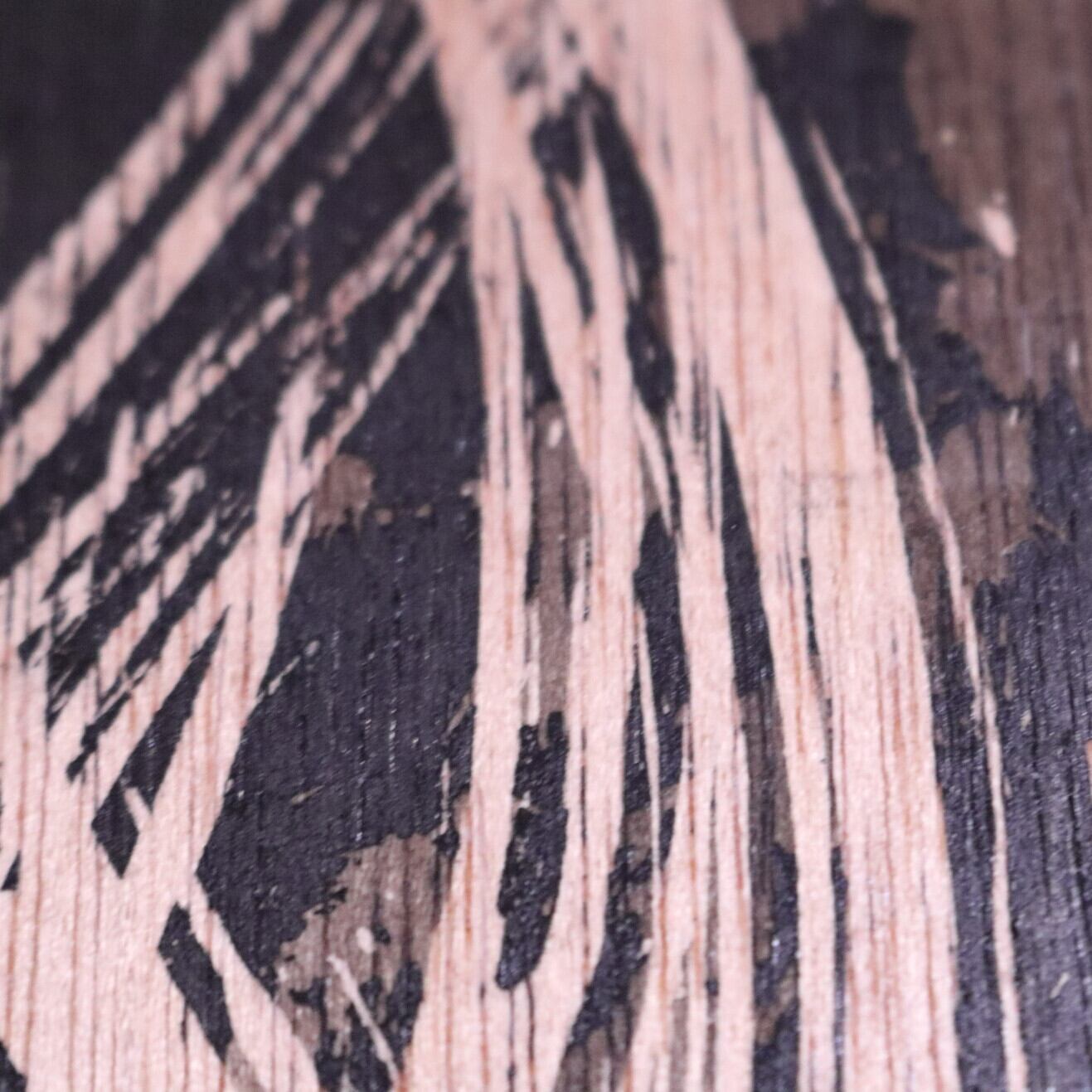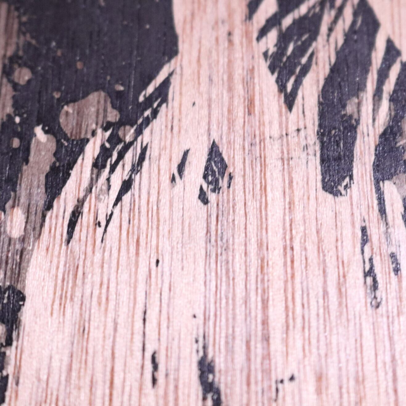 蝋で描き、墨を重ね、削り落とすことで木の色と木目が浮かび上がる独自の技法です。