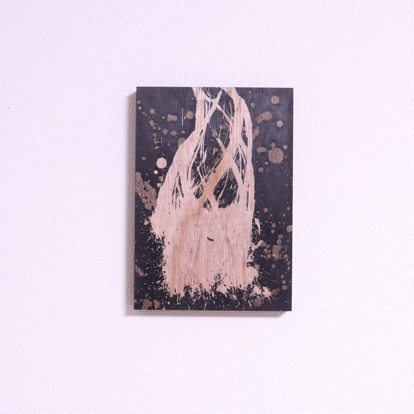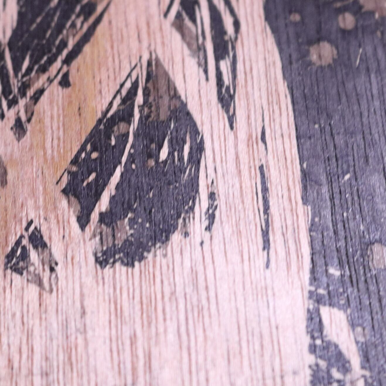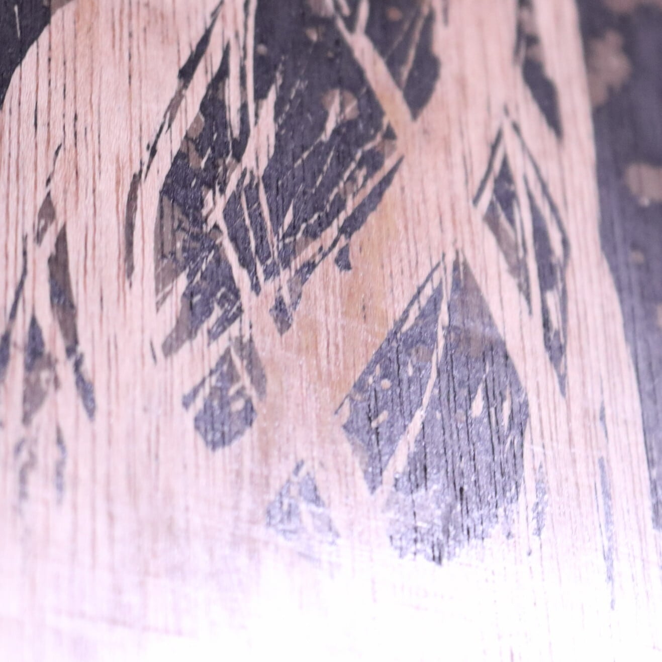 蝋で描き、墨を重ね、削り落とすことで木の色と木目が浮かび上がる独自の技法です。
