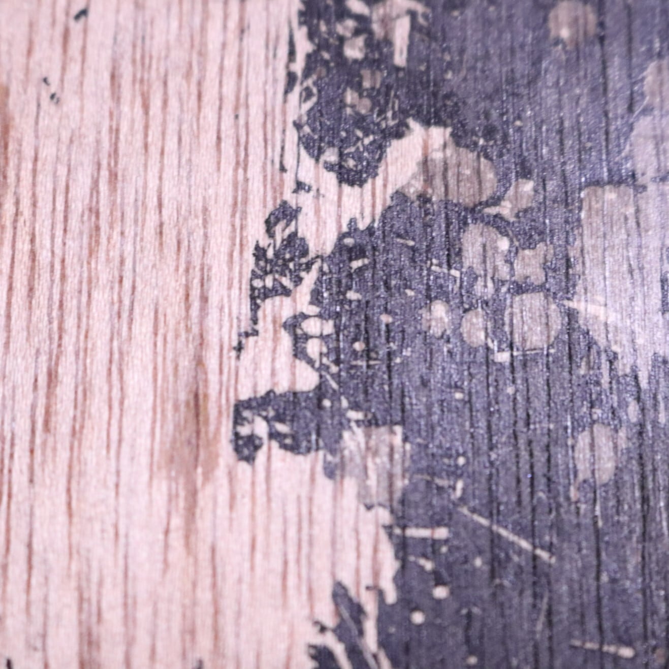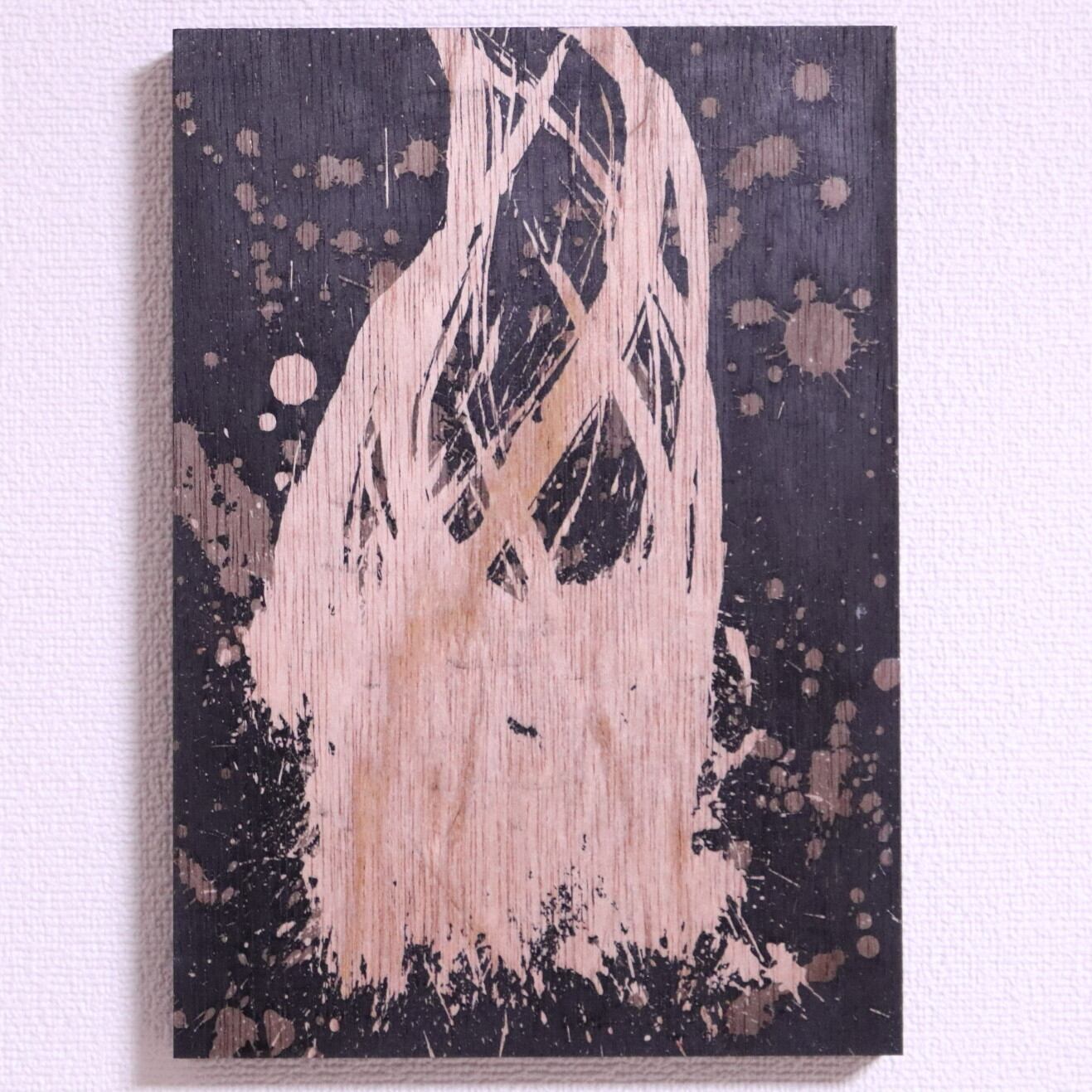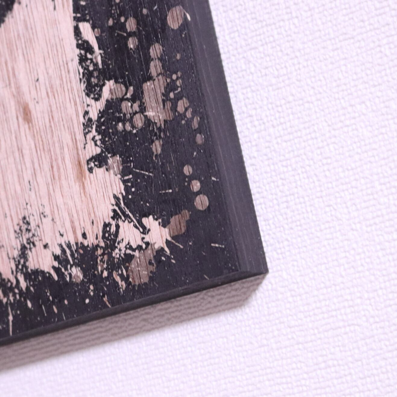 蝋で描き、墨を重ね、削り落とすことで木の色と木目が浮かび上がる独自の技法です。