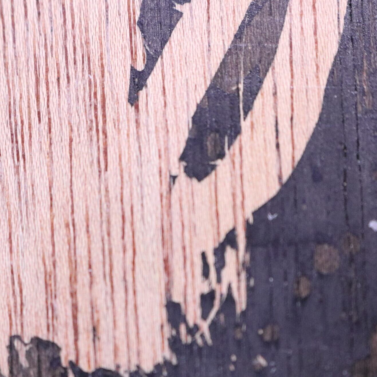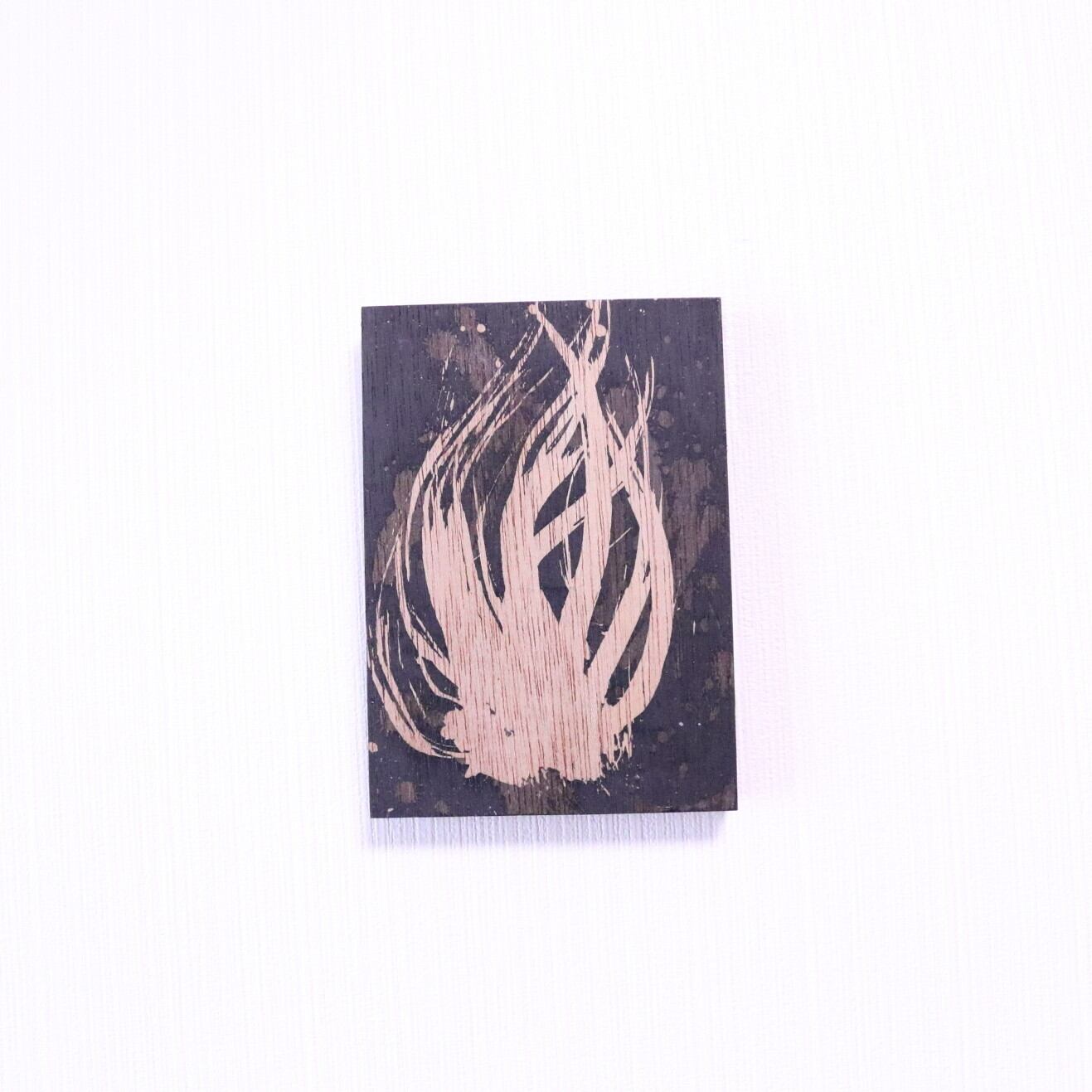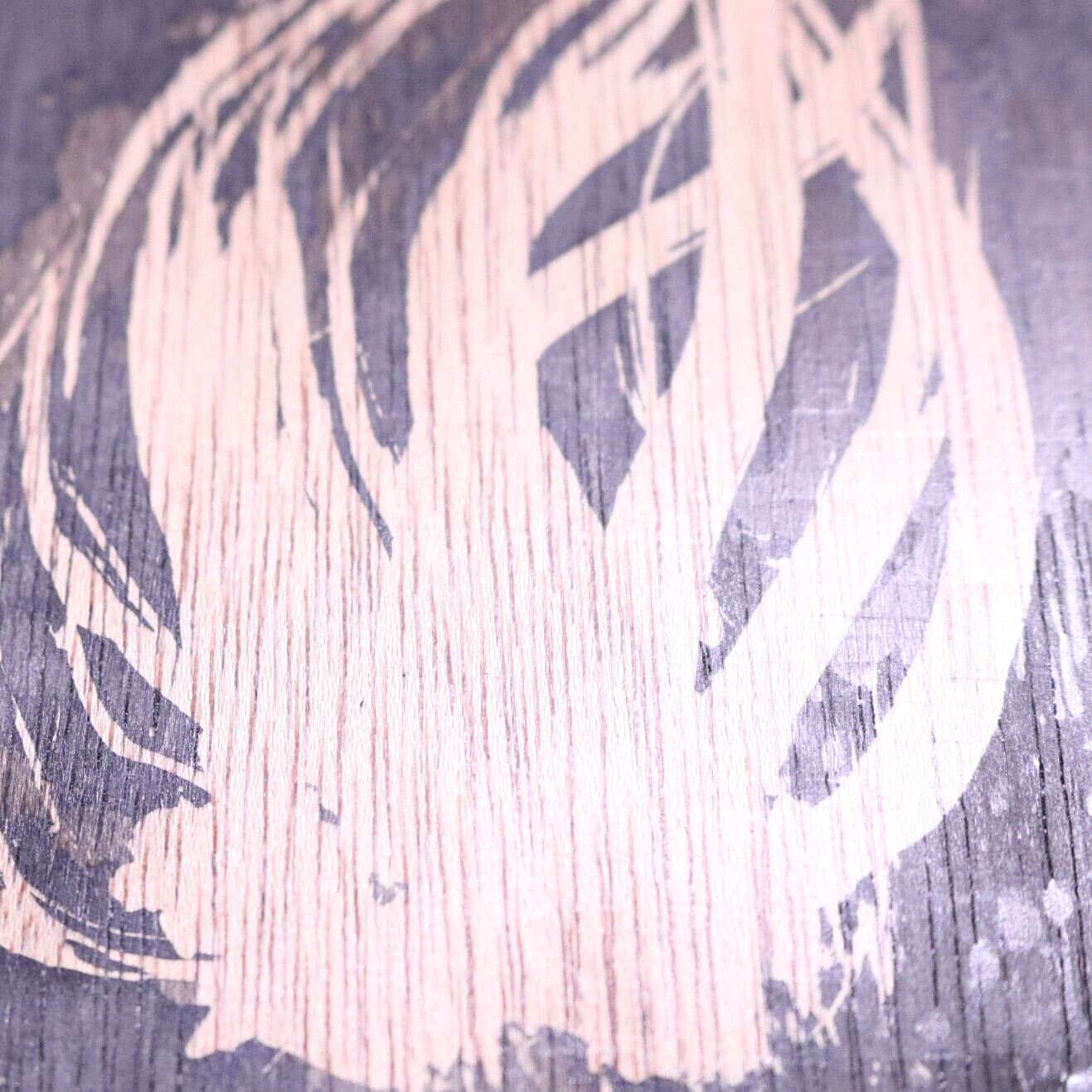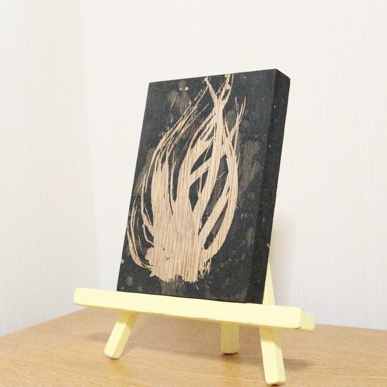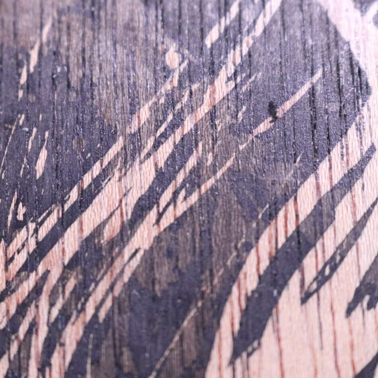蝋で描き、墨を重ね、削り落とすことで木の色と木目が浮かび上がる独自の技法です。