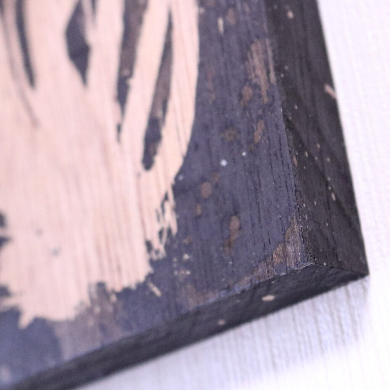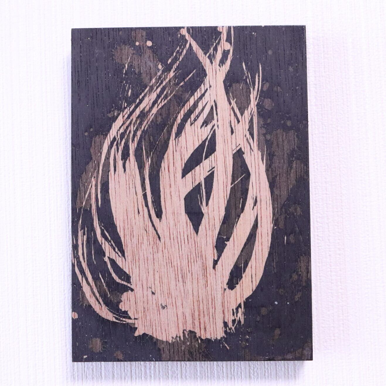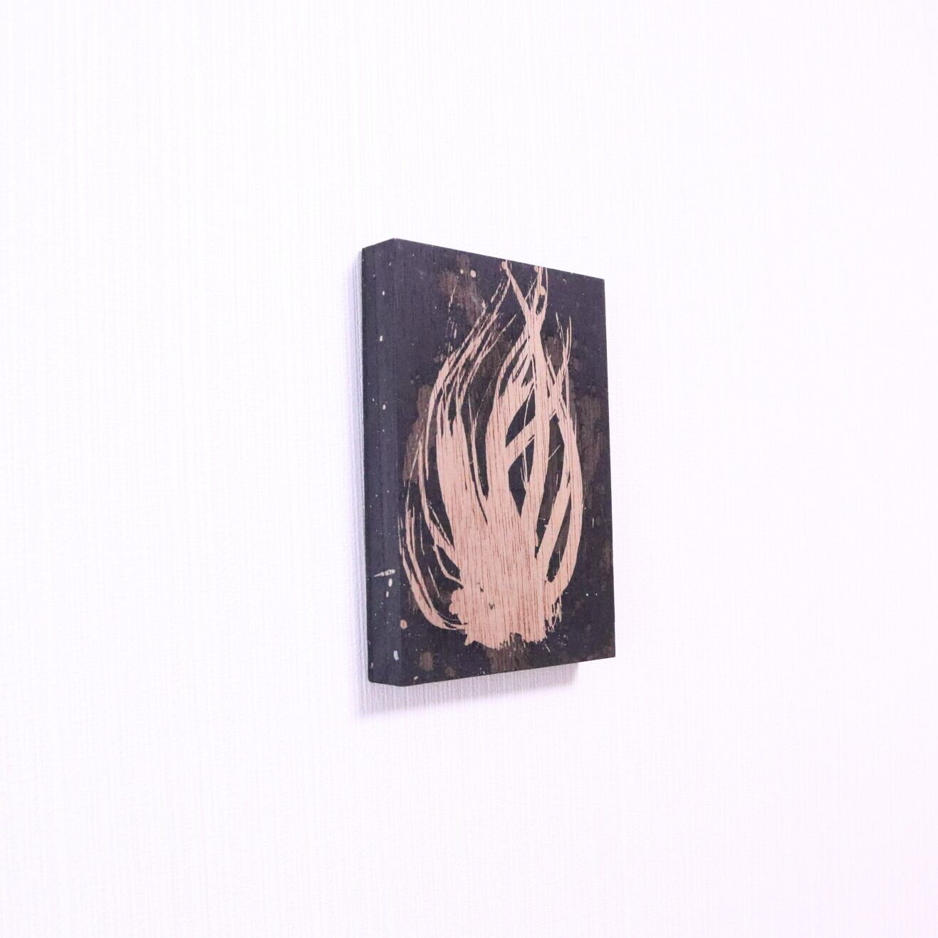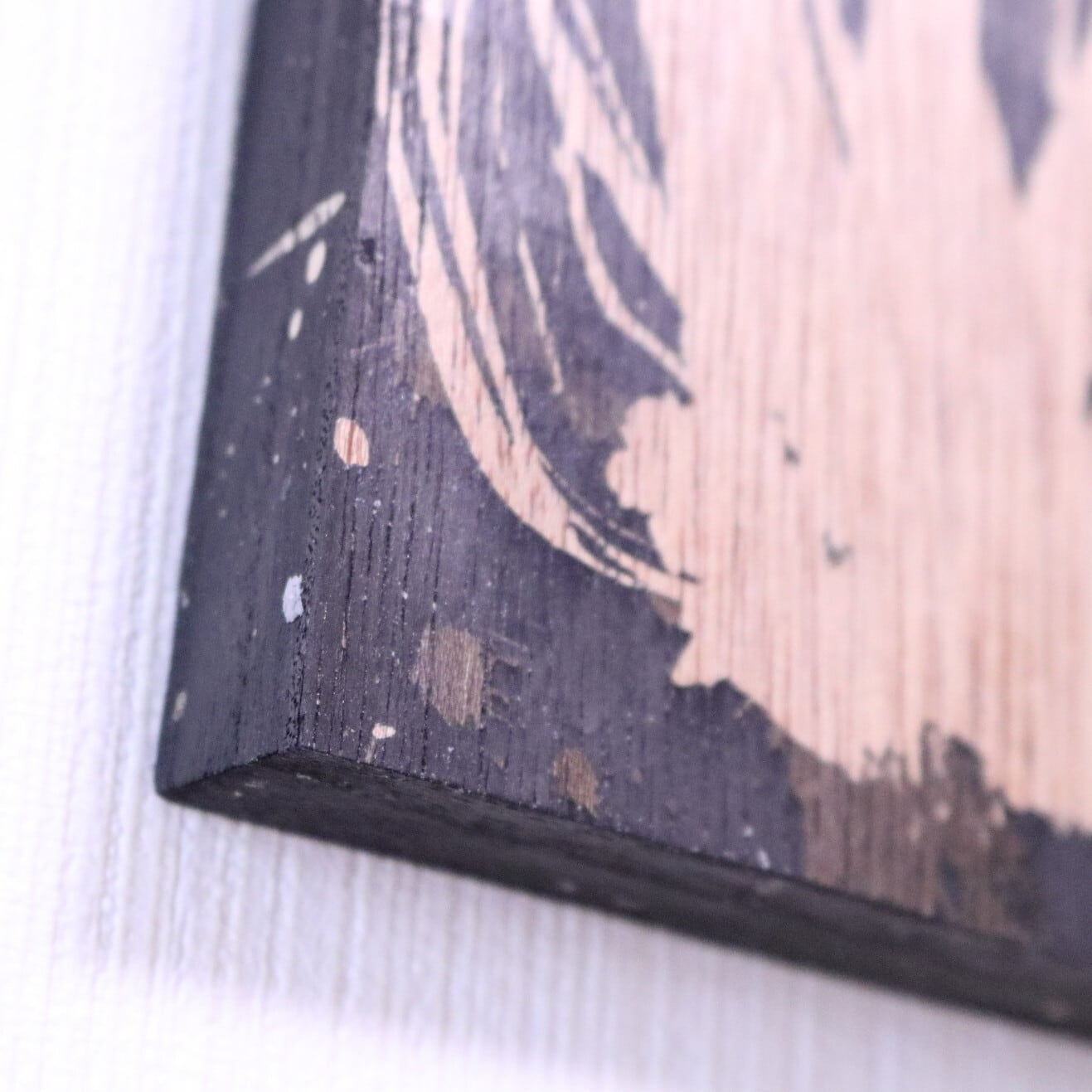 蝋で描き、墨を重ね、削り落とすことで木の色と木目が浮かび上がる独自の技法です。