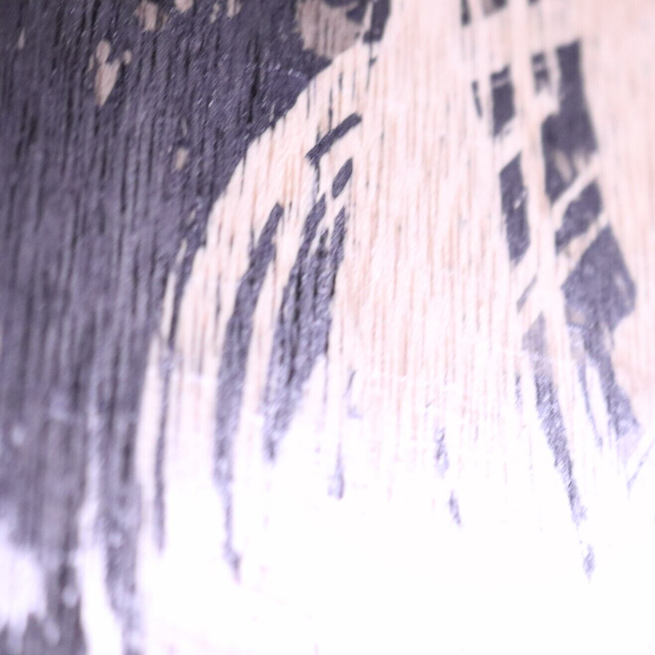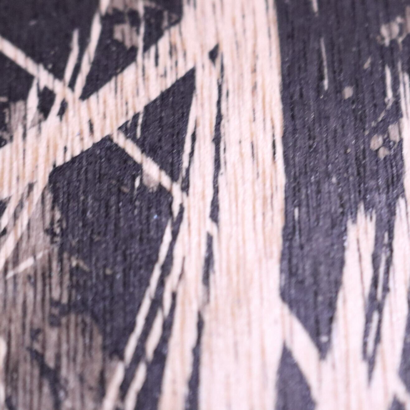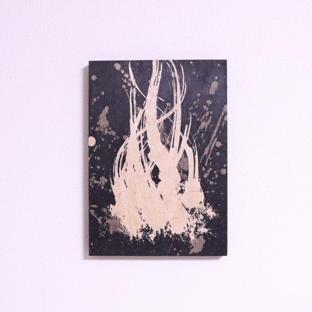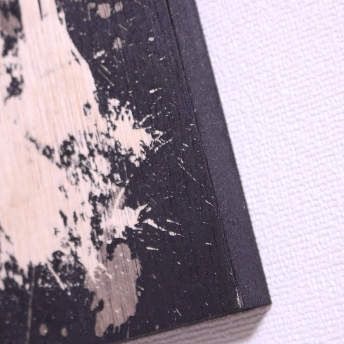 蝋で描き、墨を重ね、削り落とすことで木の色と木目が浮かび上がる独自の技法です。