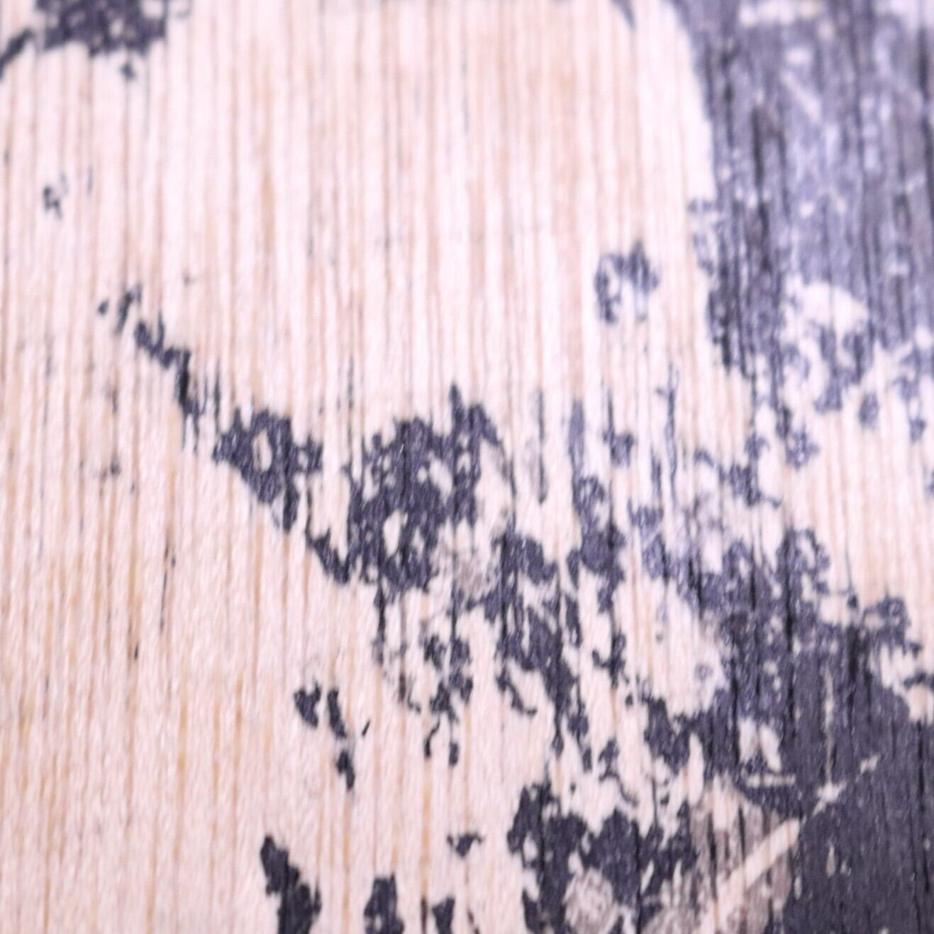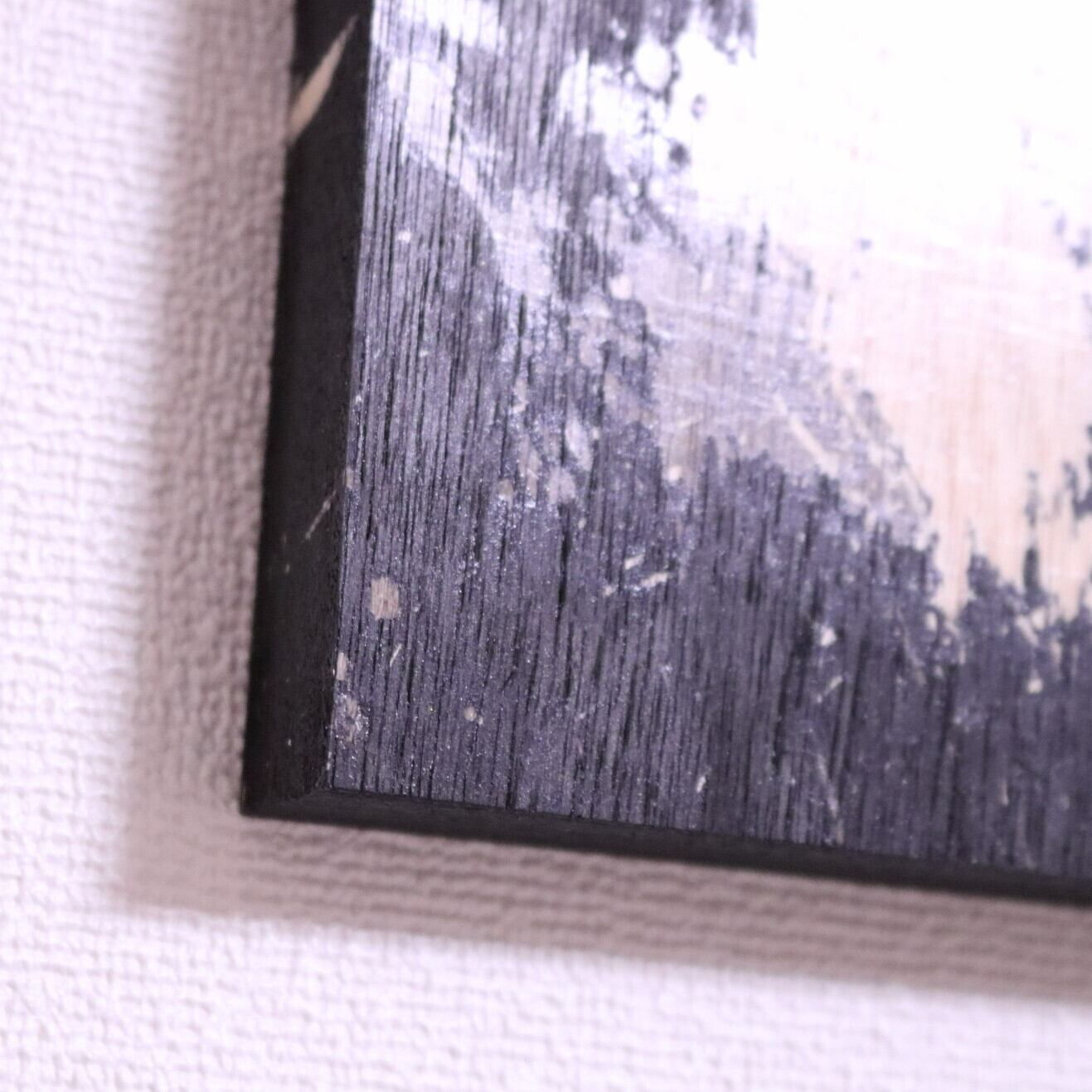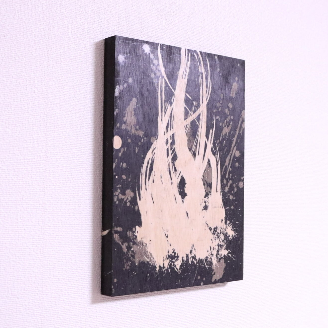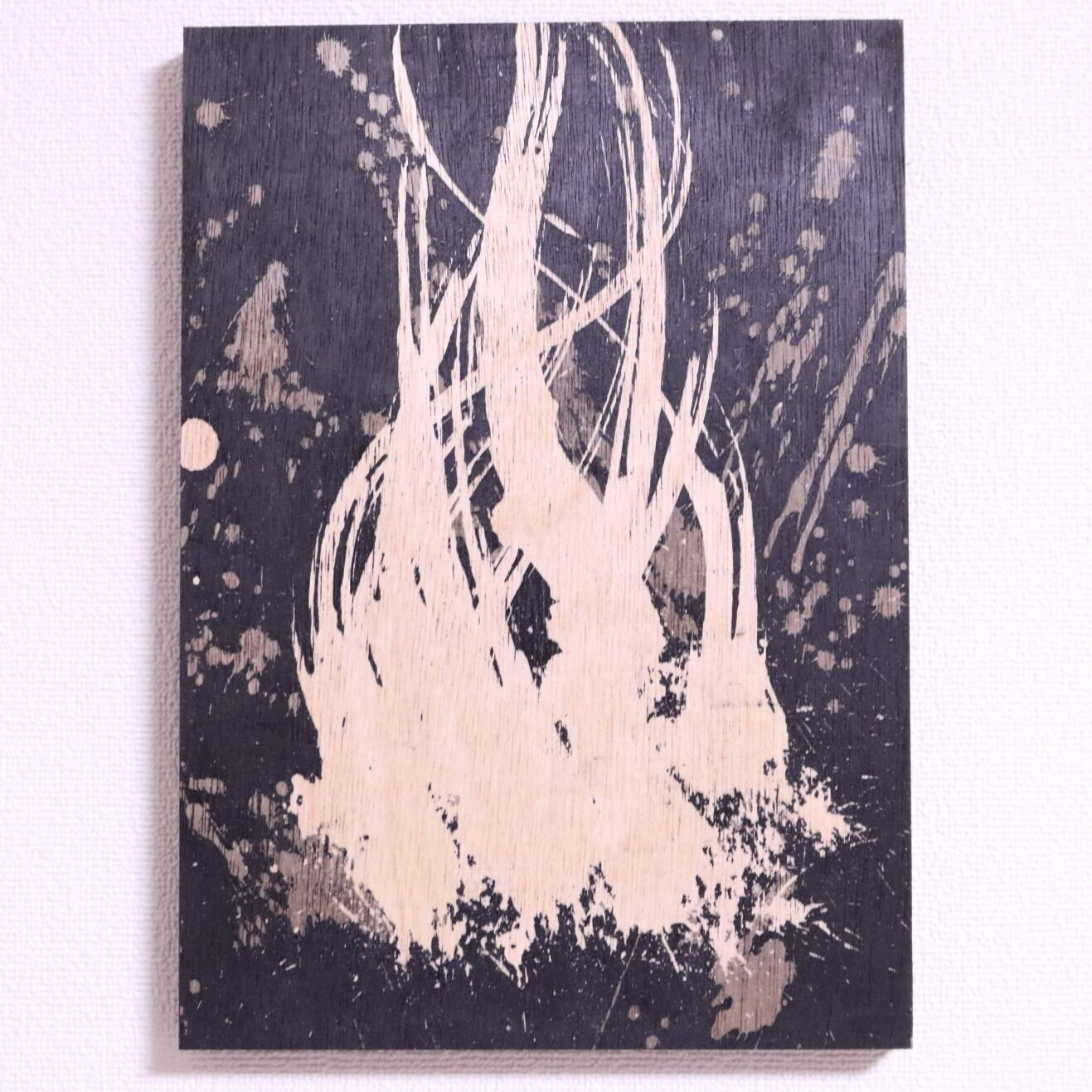 蝋で描き、墨を重ね、削り落とすことで木の色と木目が浮かび上がる独自の技法です。