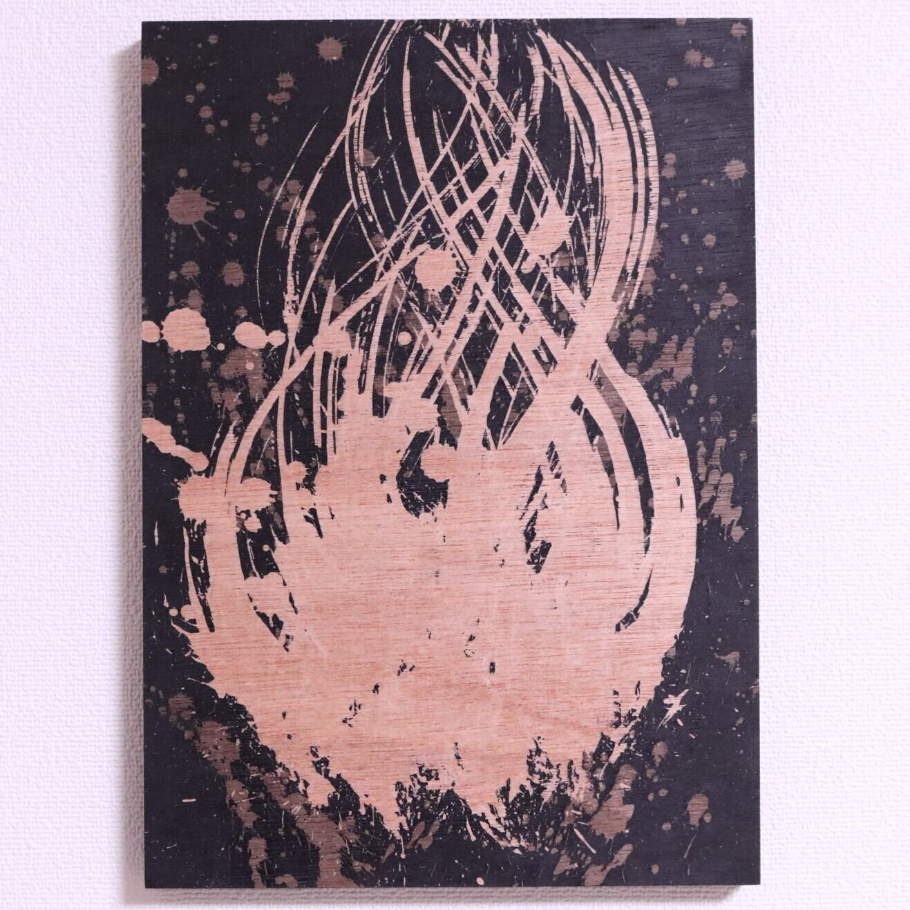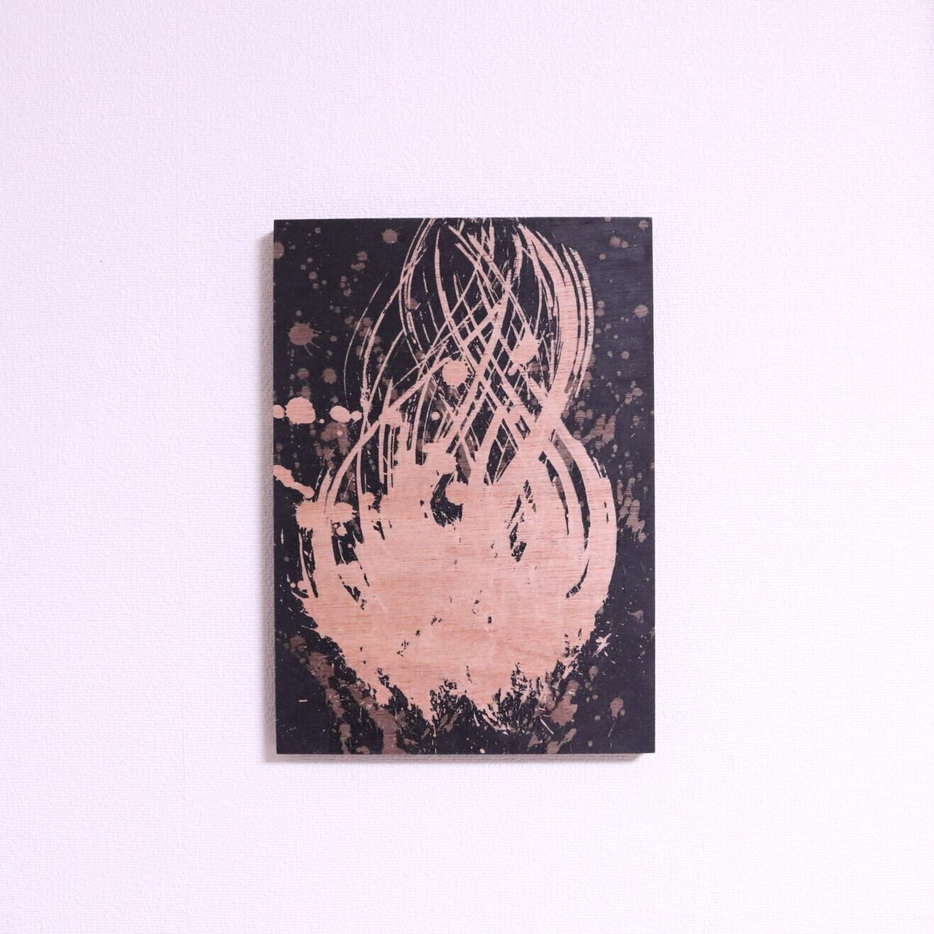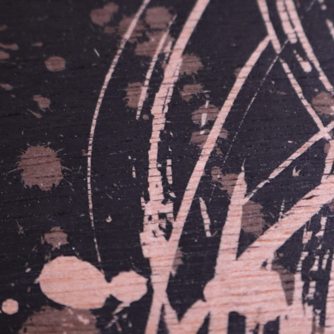 蝋で描き、墨を重ね、削り落とすことで木の色と木目が浮かび上がる独自の技法です。