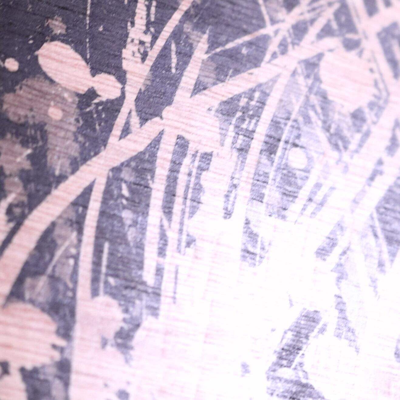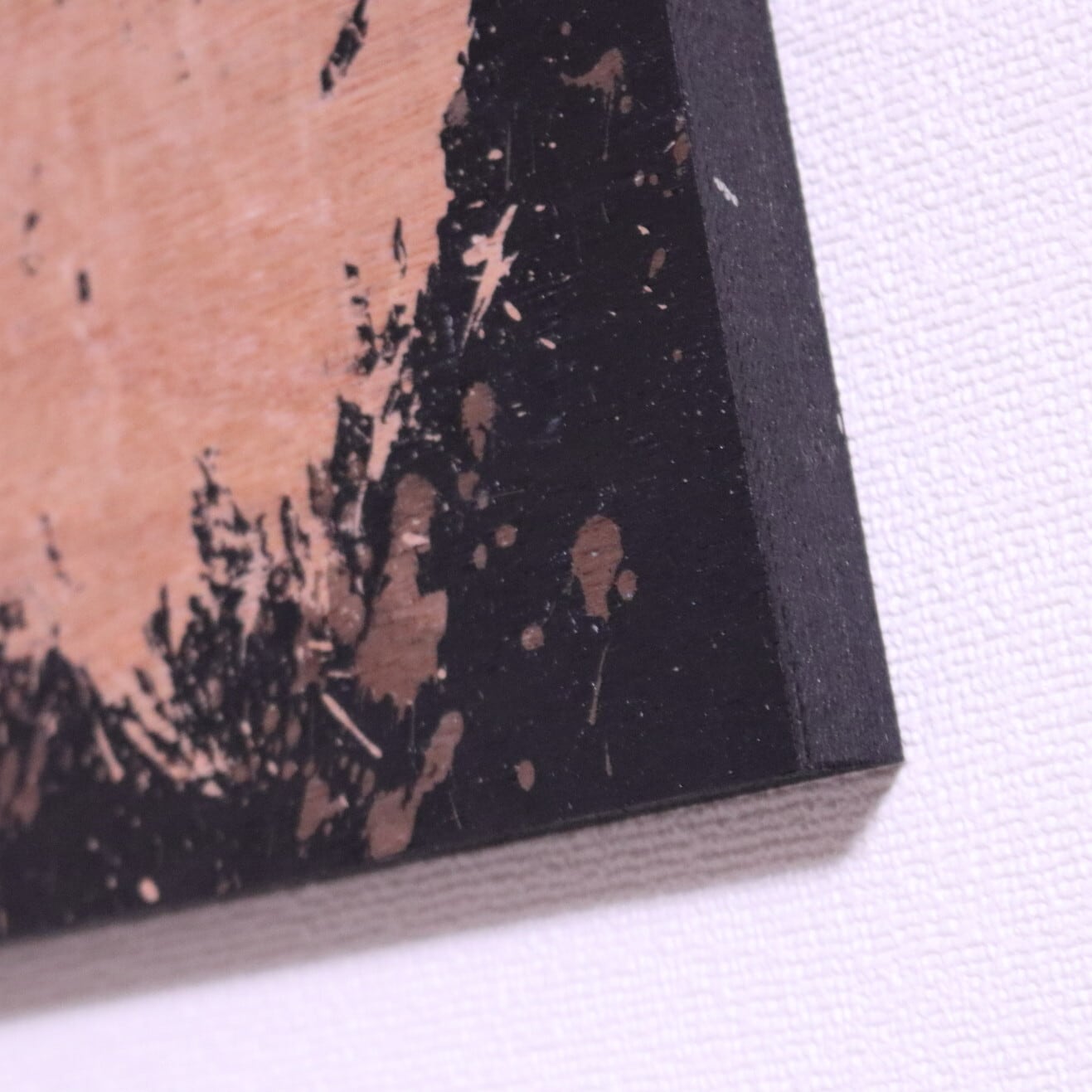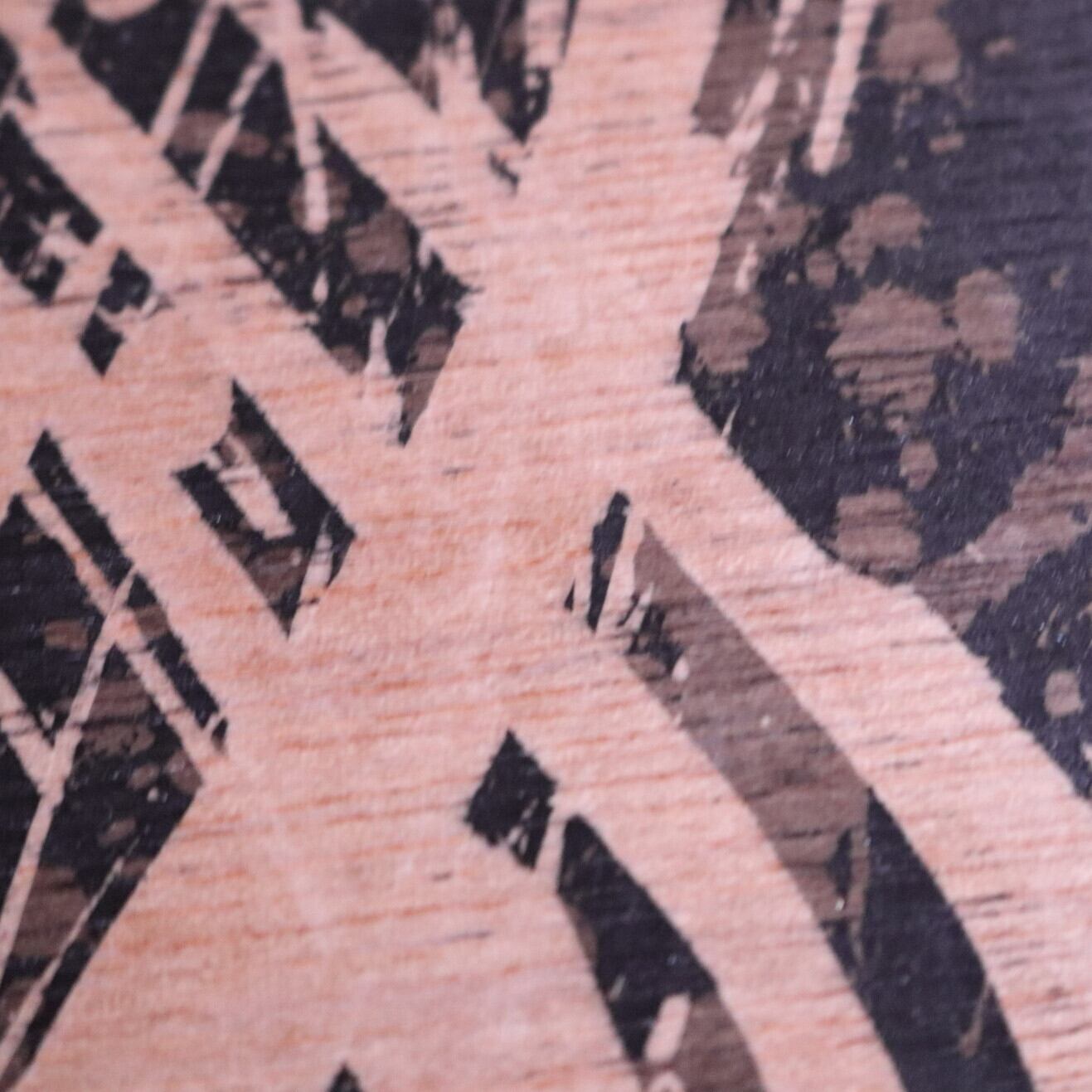 蝋で描き、墨を重ね、削り落とすことで木の色と木目が浮かび上がる独自の技法です。