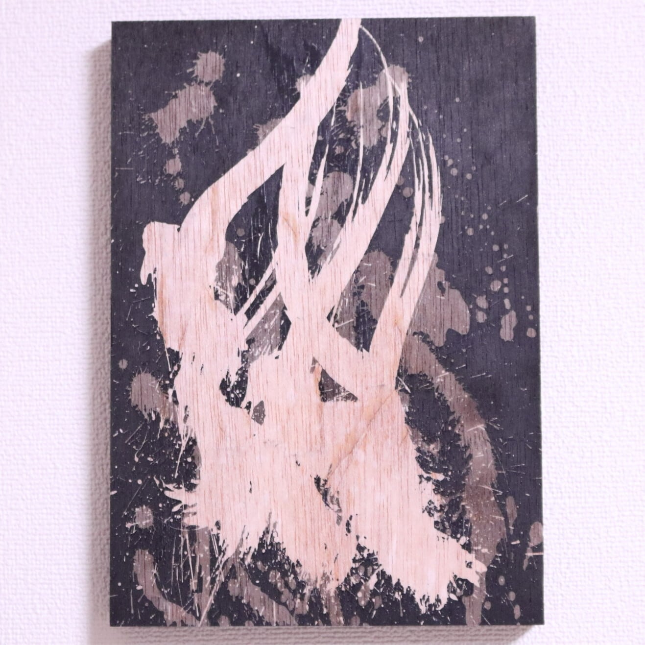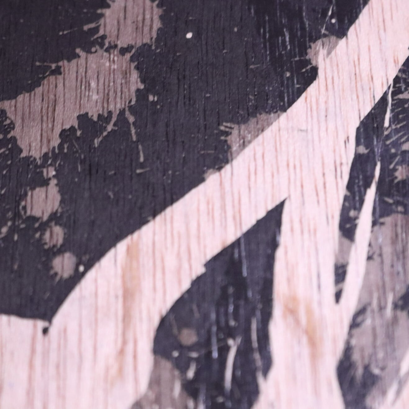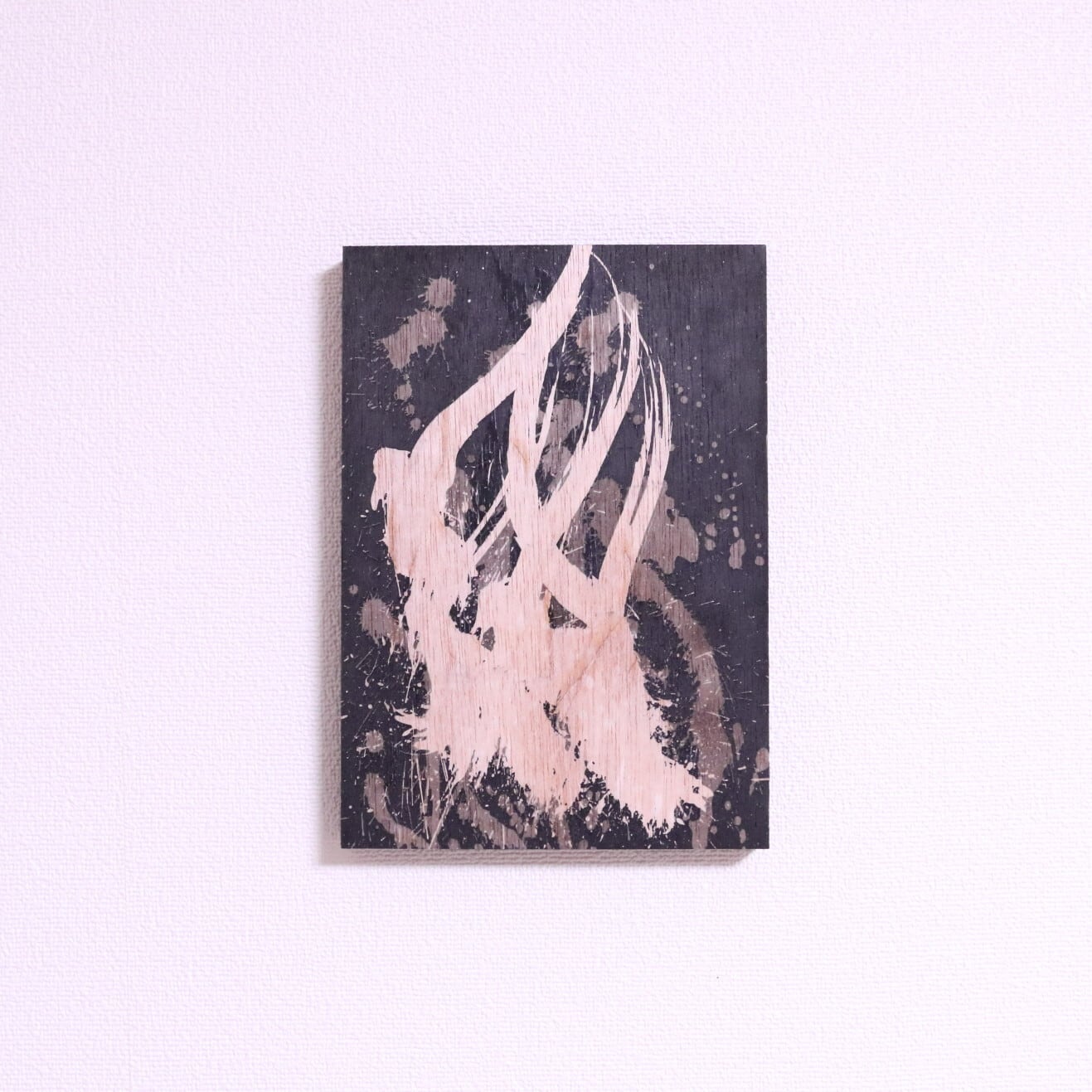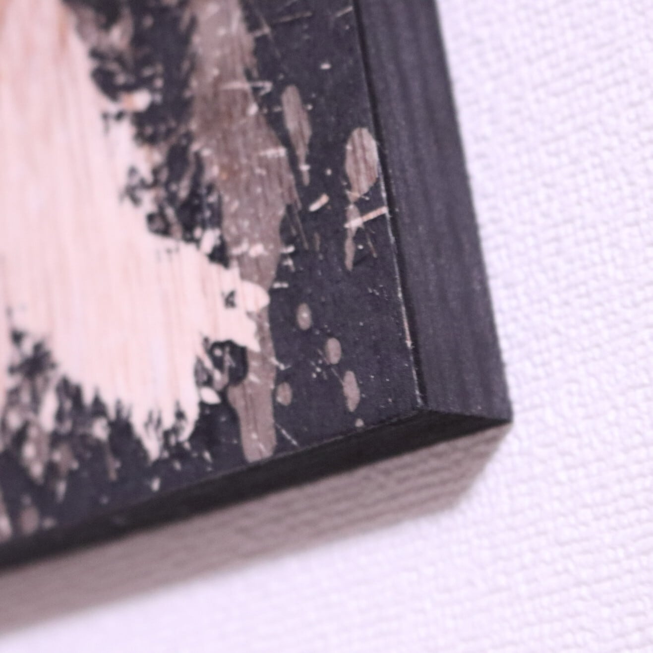 蝋で描き、墨を重ね、削り落とすことで木の色と木目が浮かび上がる独自の技法です。