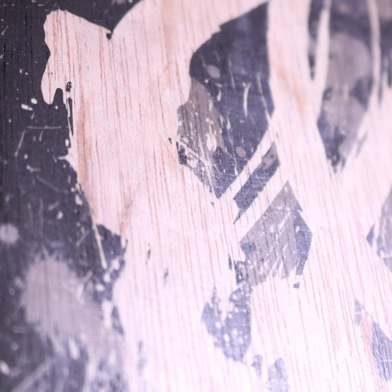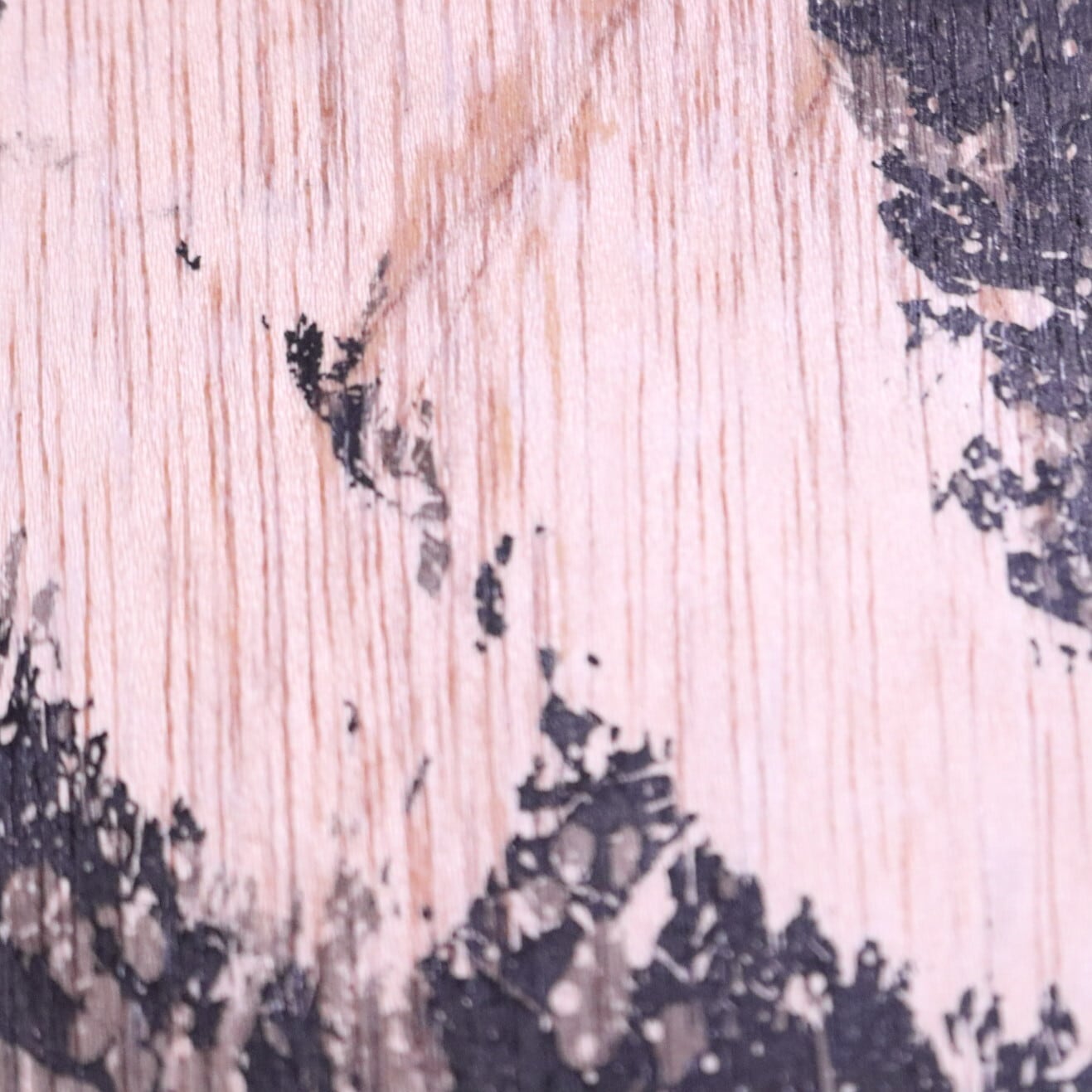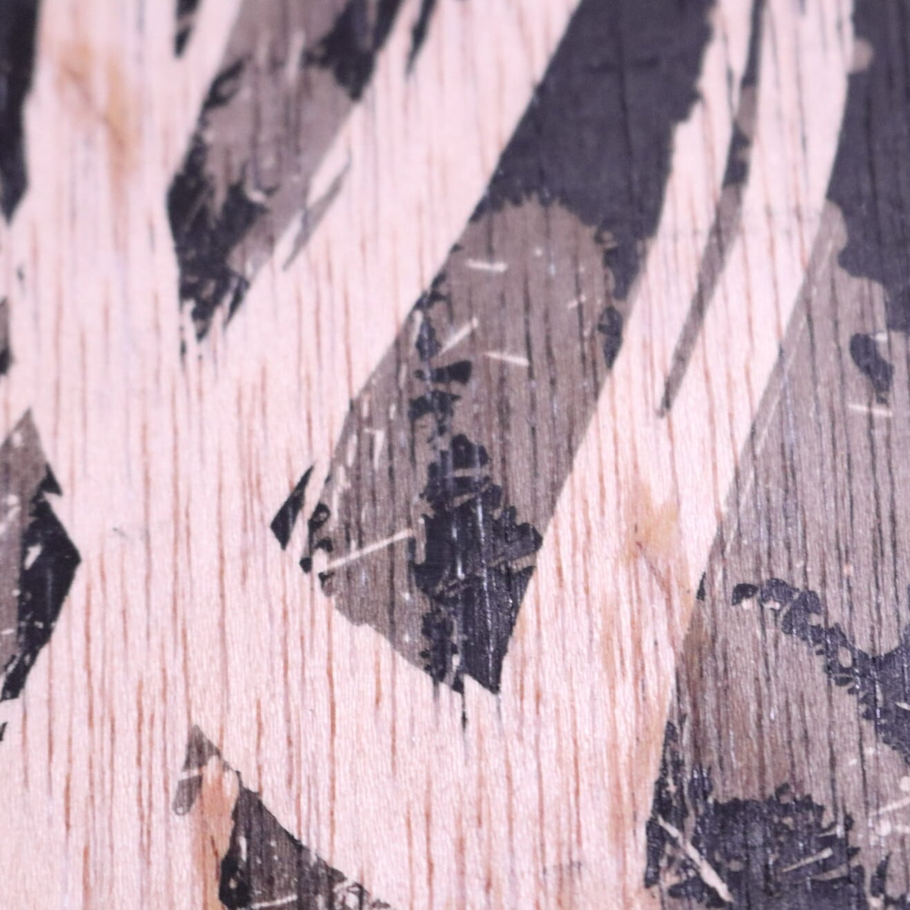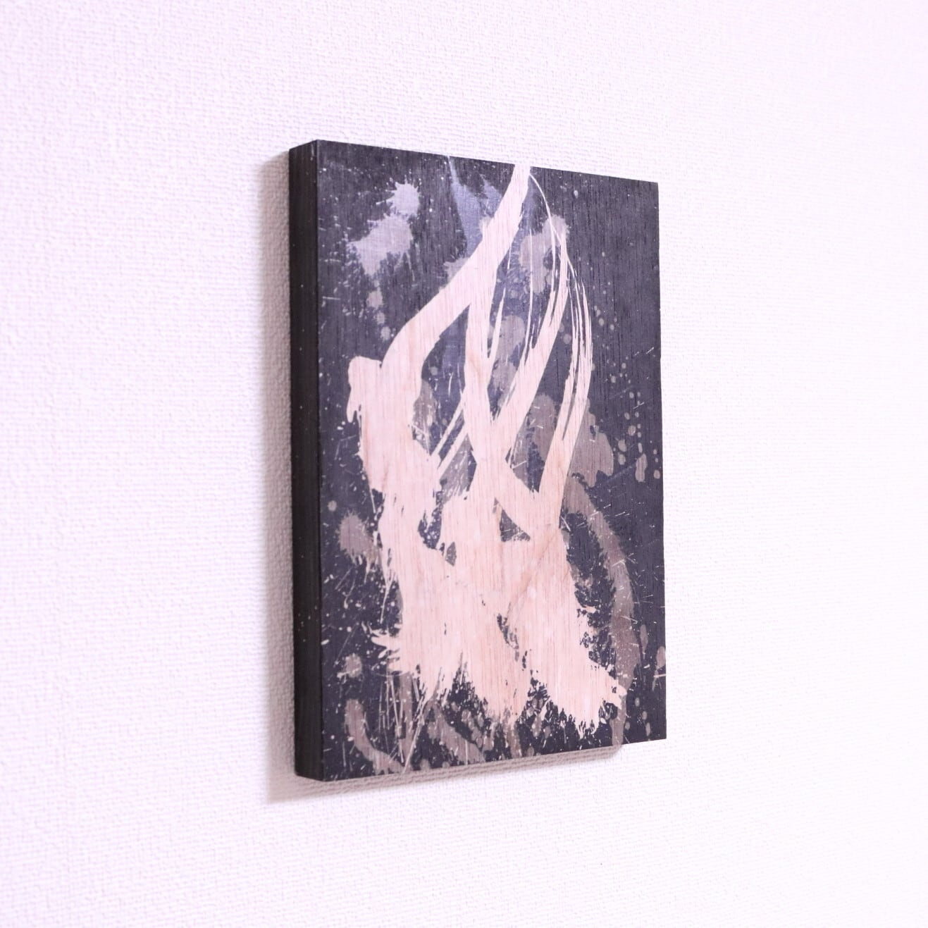 蝋で描き、墨を重ね、削り落とすことで木の色と木目が浮かび上がる独自の技法です。