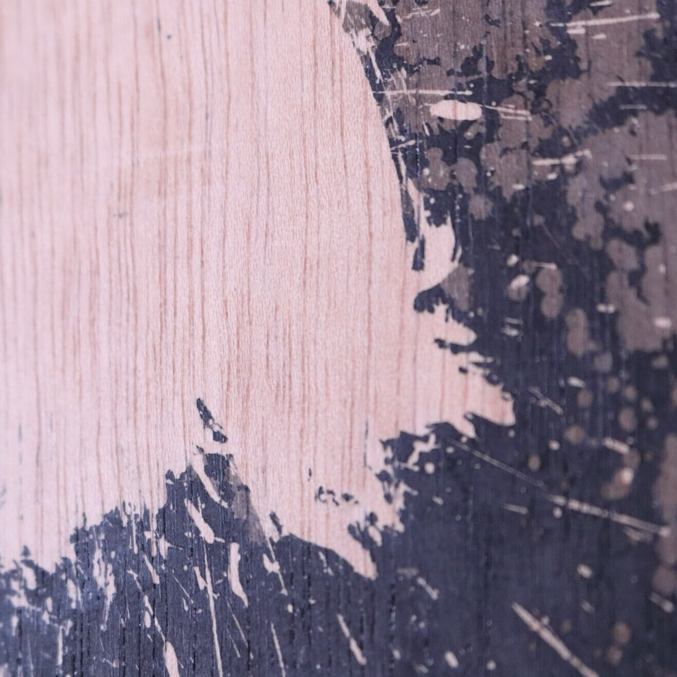 蝋で描き、墨を重ね、削り落とすことで木の色と木目が浮かび上がる独自の技法です。