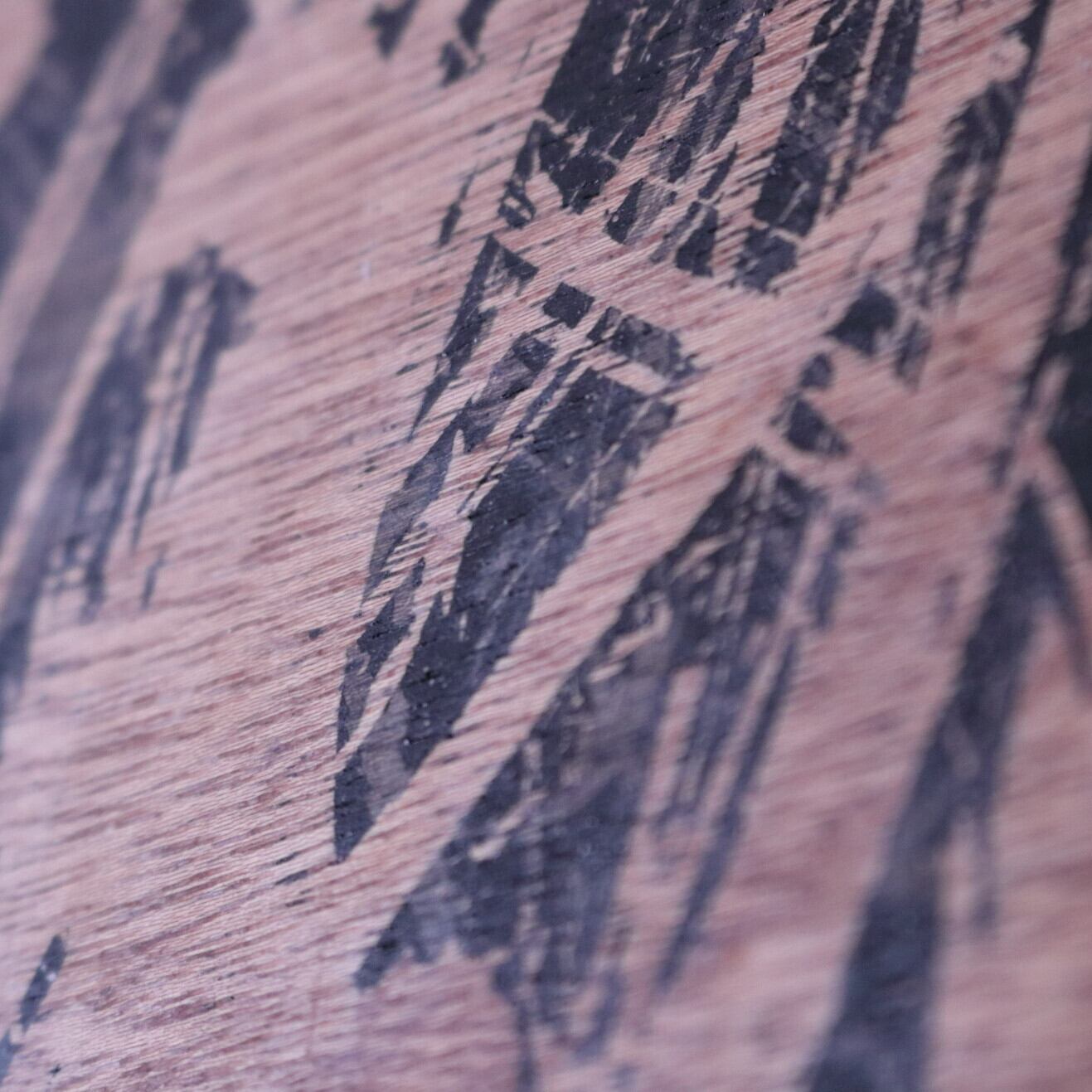 蝋で描き、墨を重ね、削り落とすことで木の色と木目が浮かび上がる独自の技法です。