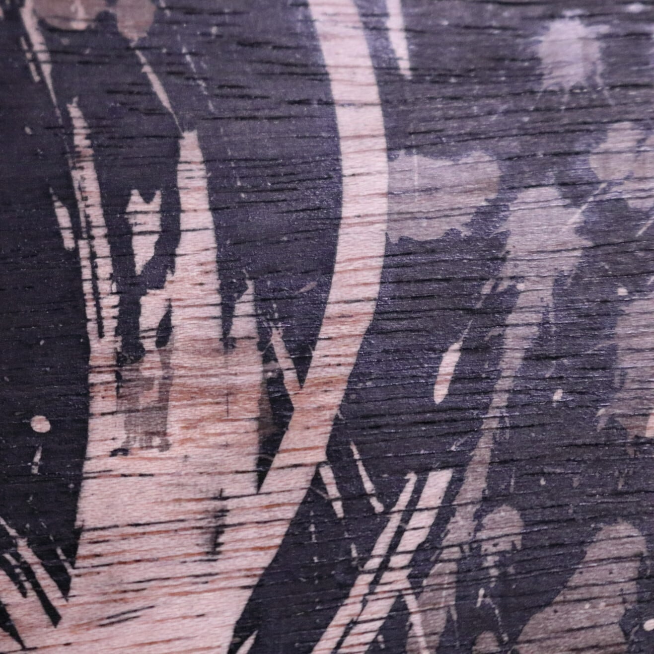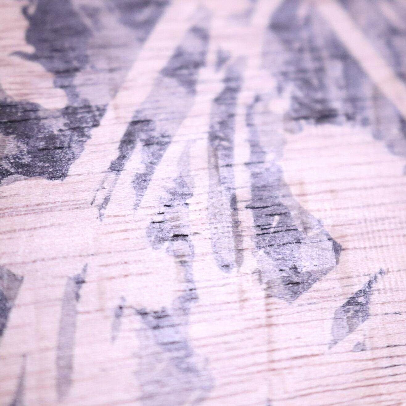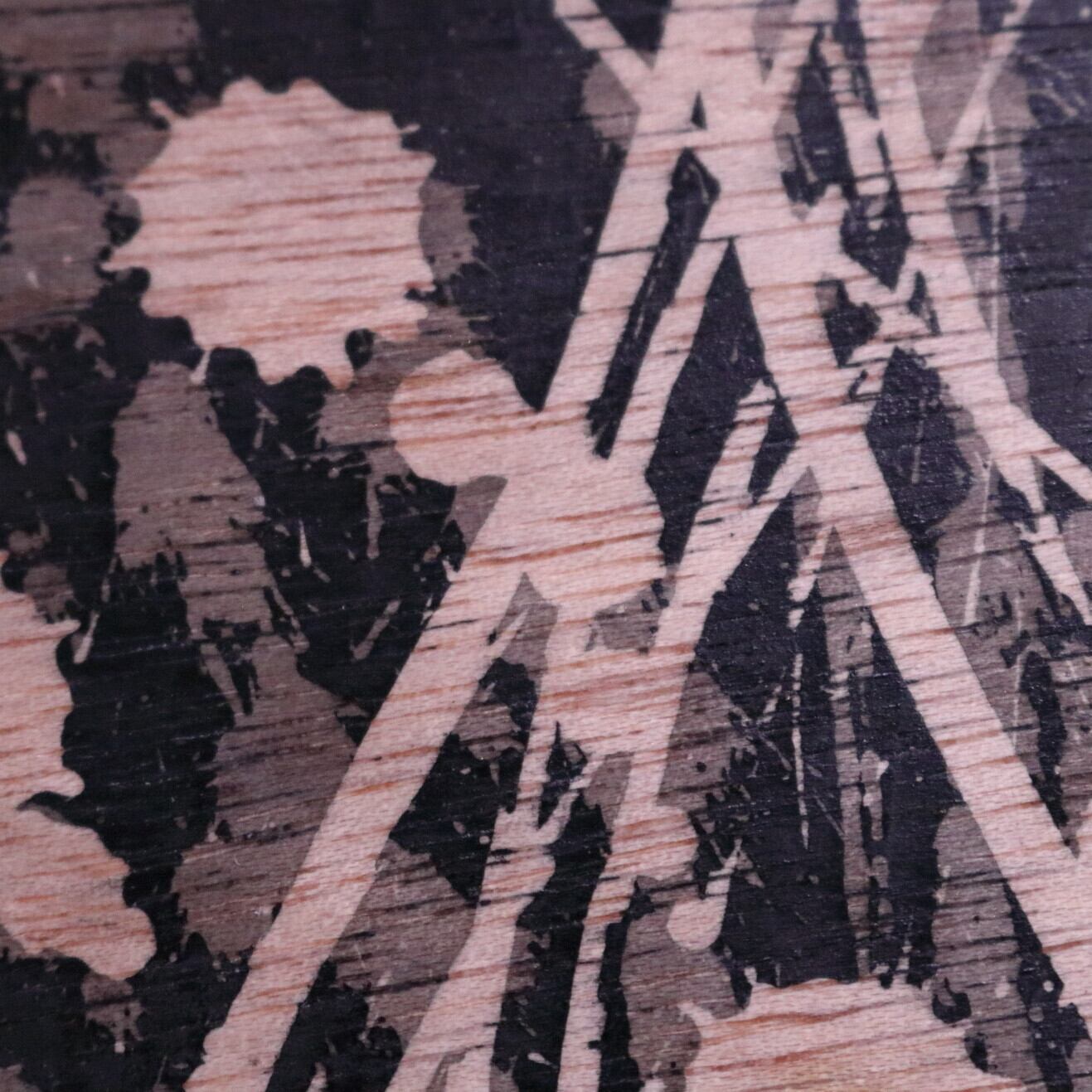蝋で描き、墨を重ね、削り落とすことで木の色と木目が浮かび上がる独自の技法です。