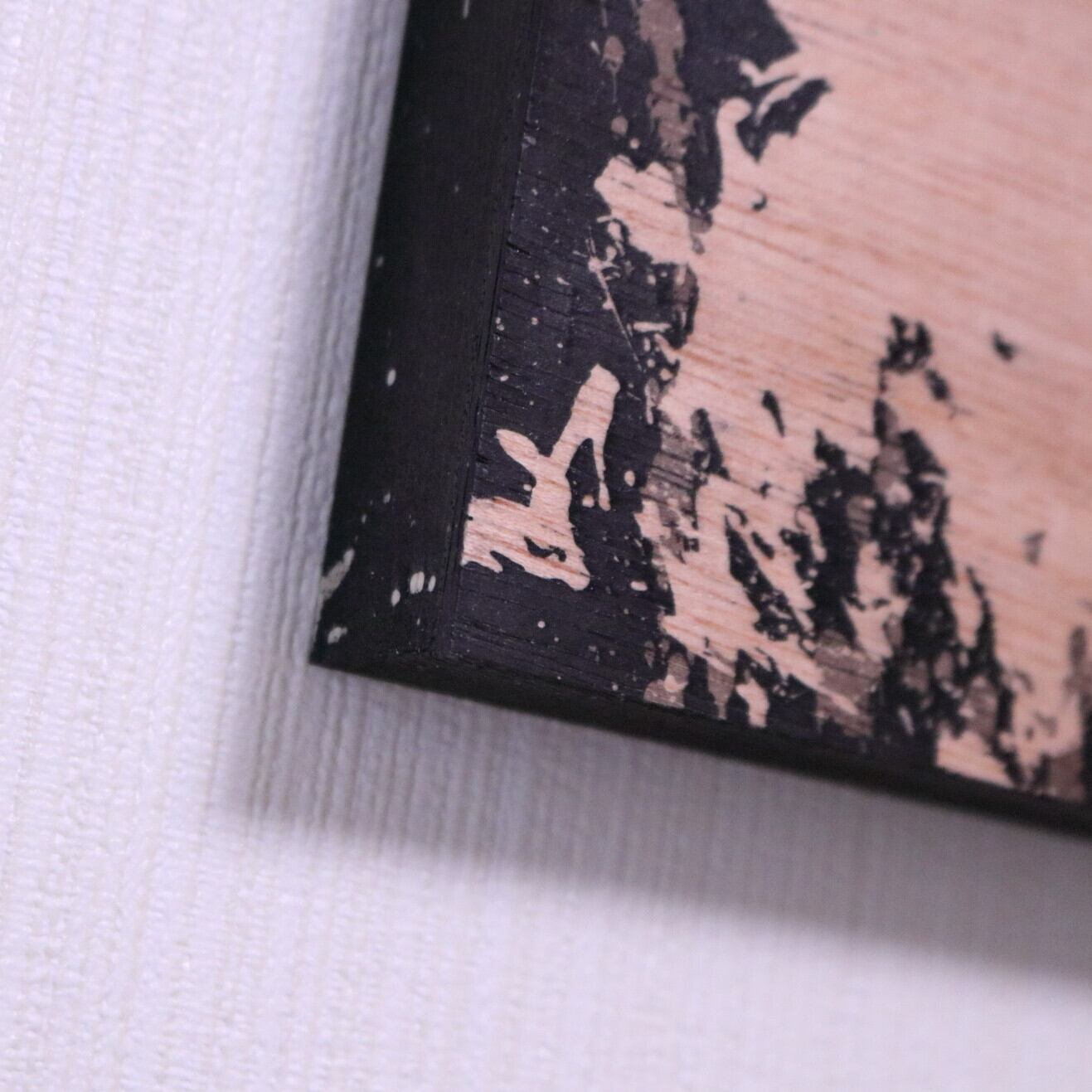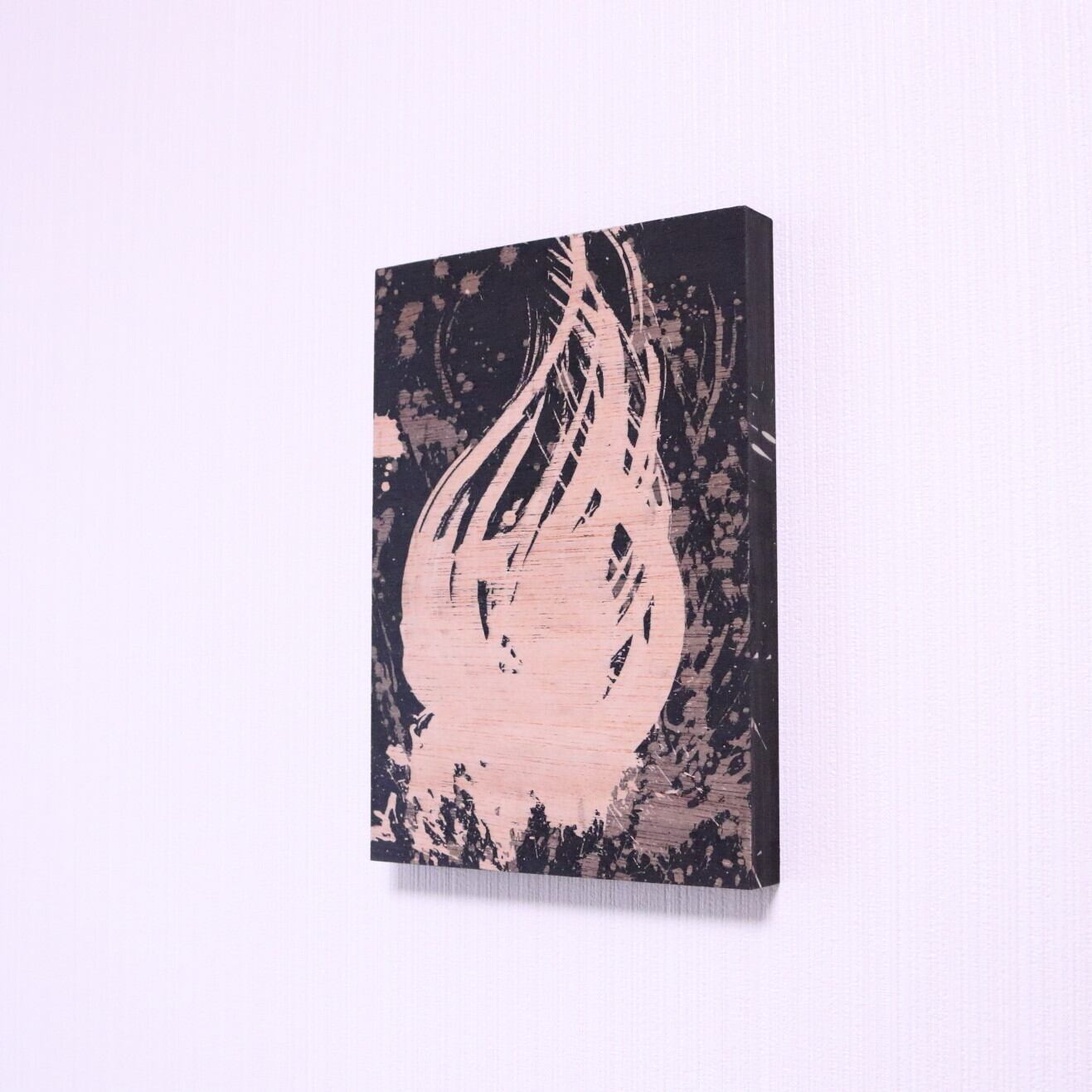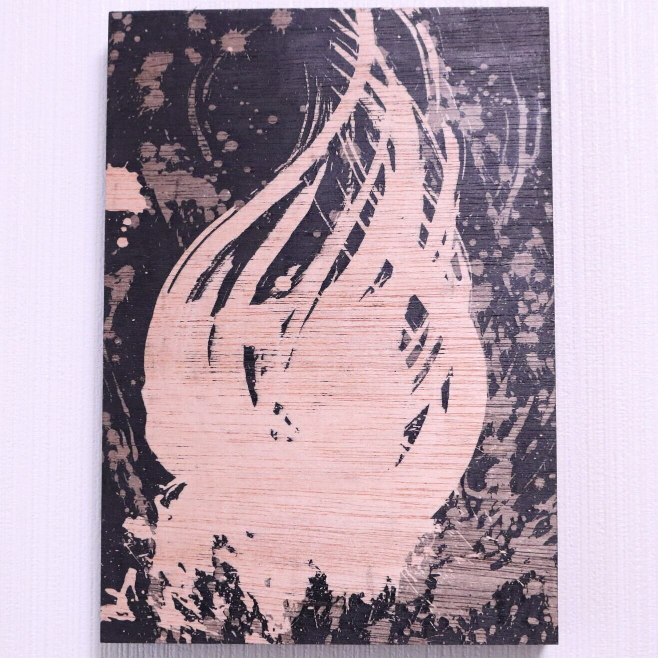 ・技法:蝋削画(蝋・墨・木製パネル)