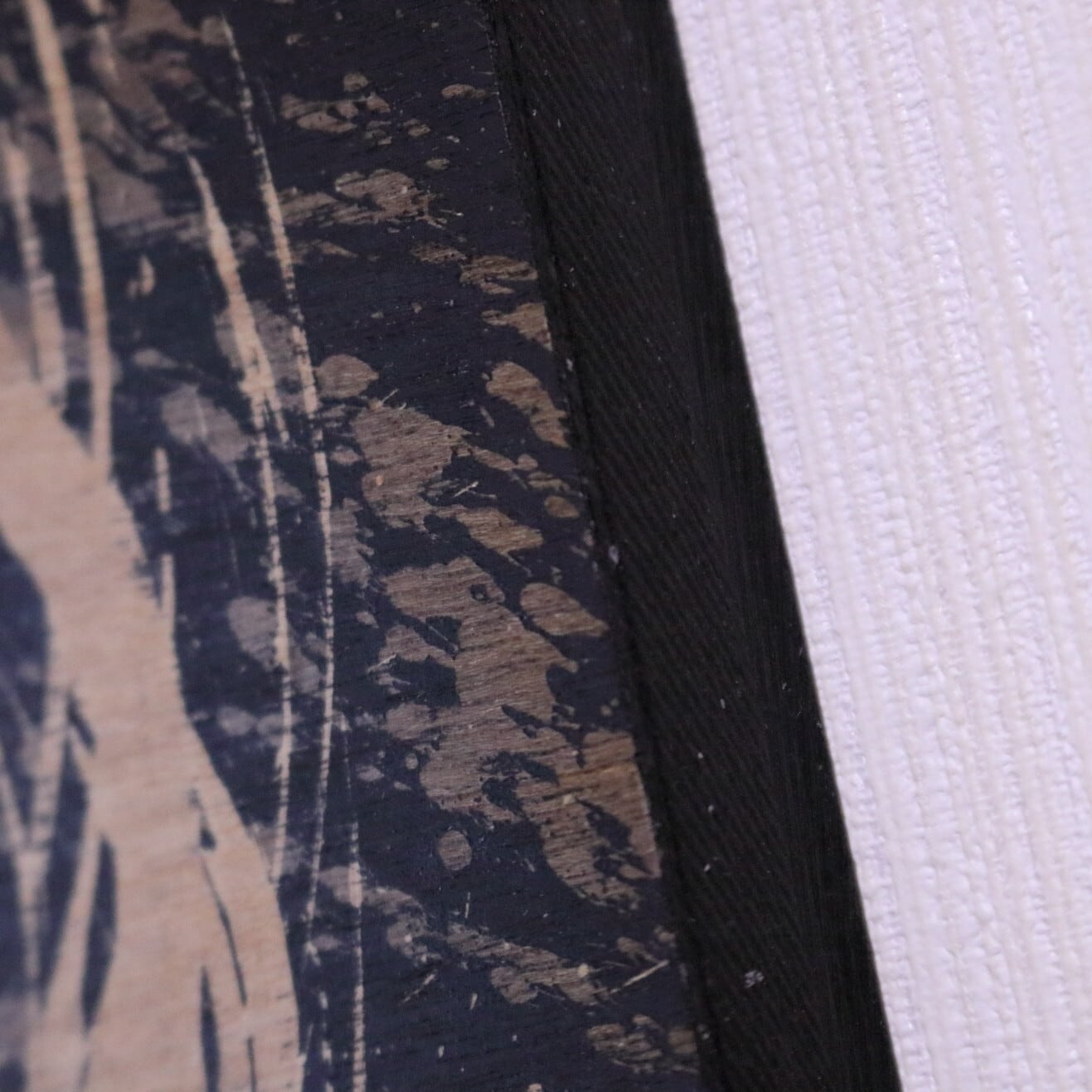 蝋で描き、墨を重ね、削り落とすことで木の色と木目が浮かび上がる独自の技法です。