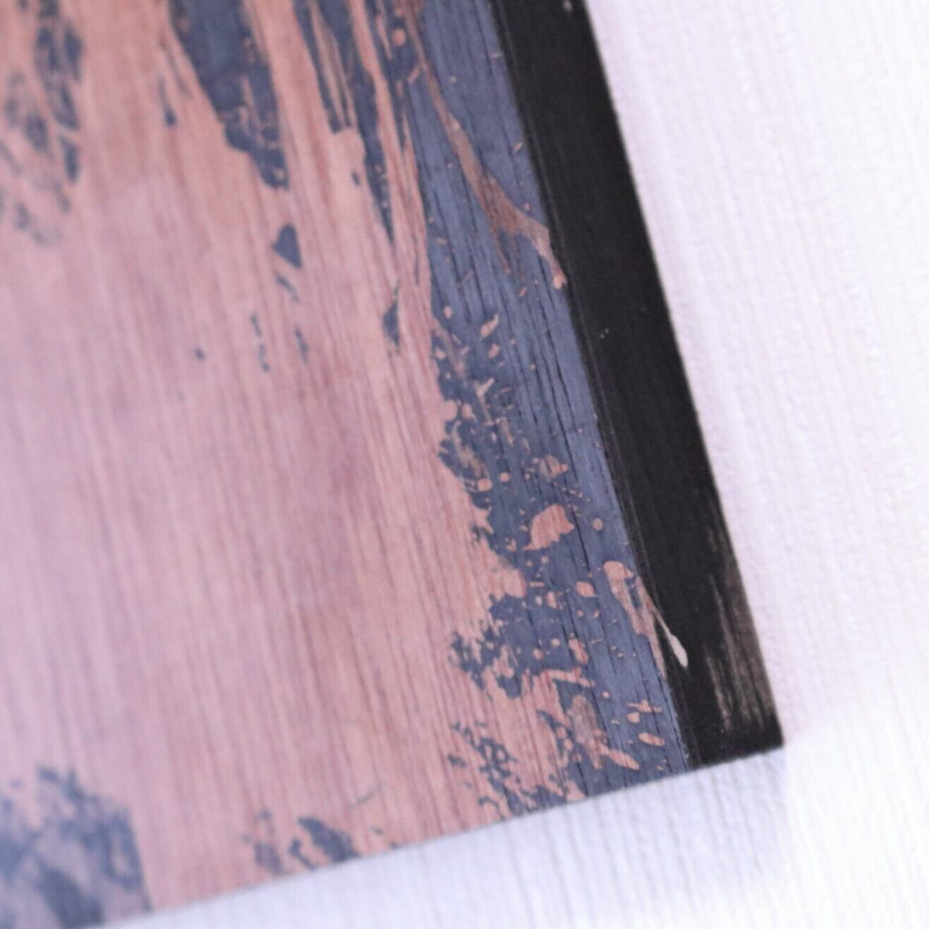蝋で描き、墨を重ね、削り落とすことで木の色と木目が浮かび上がる独自の技法です。