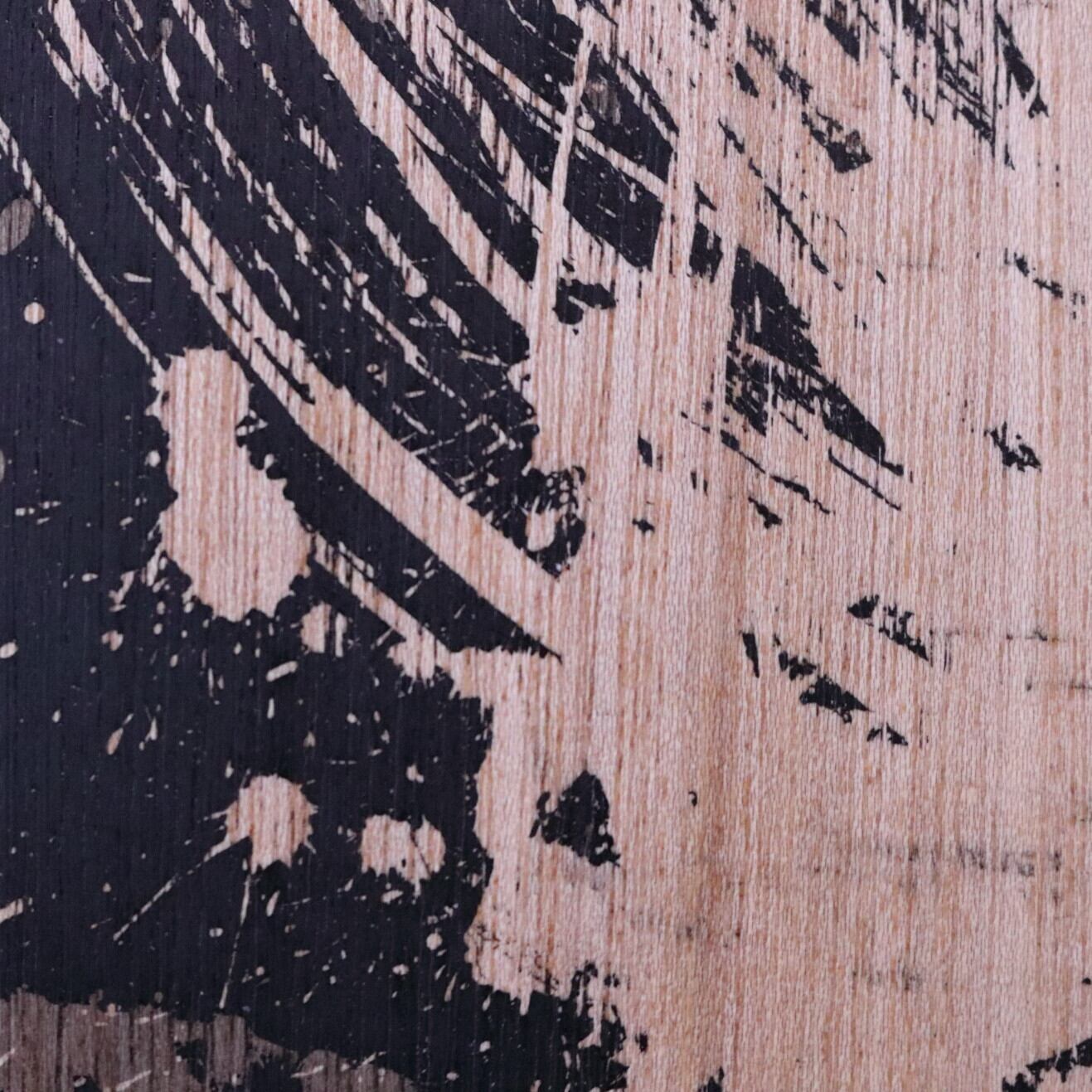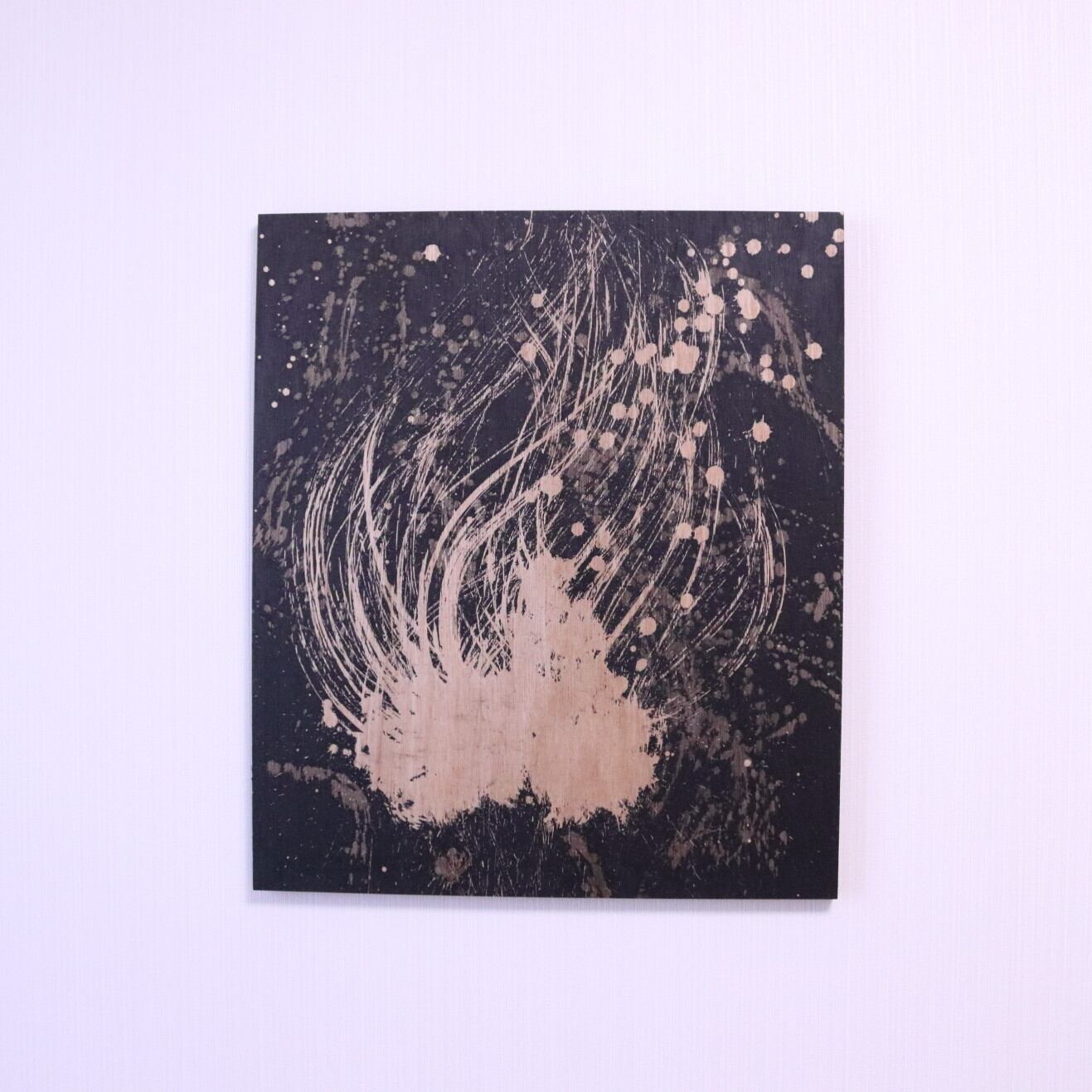蝋で描き、墨を重ね、削り落とすことで木の色と木目が浮かび上がる独自の技法です。